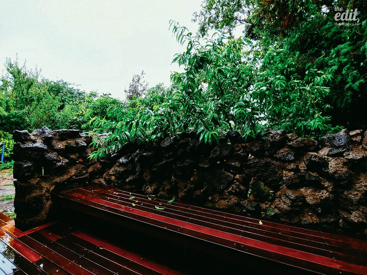 숙소 입구에는 돌담 앞에 앉아 잠시 쉴 수 있는 벤치도 마련돼 있다. 일본의 어느 작은 료칸에 온 기분이다.