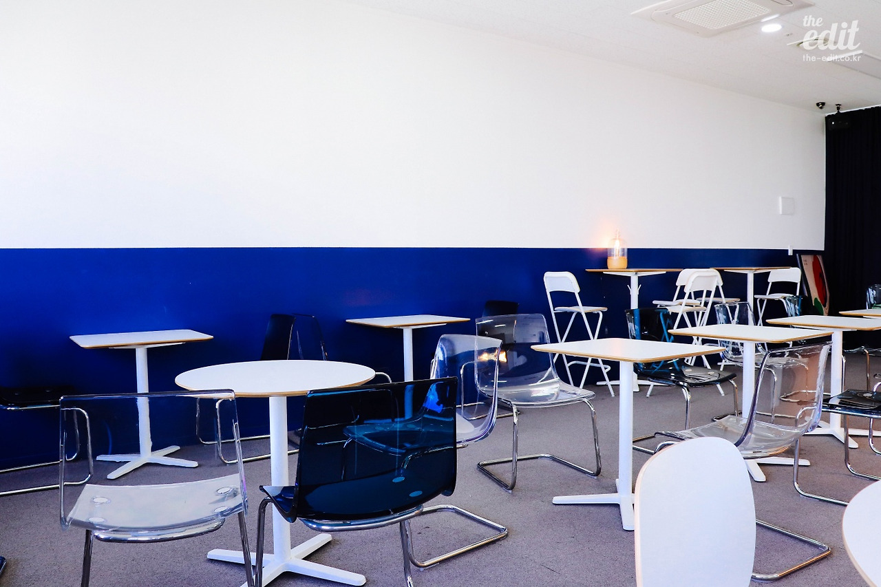 짙은 파란색으로 단정하게 꾸며진 공간. 묘하게 항공사 로고를 닮아있는 카페의 로고 덕분에 공항의 라운지에 와 있는 기분이 들기도 한다.