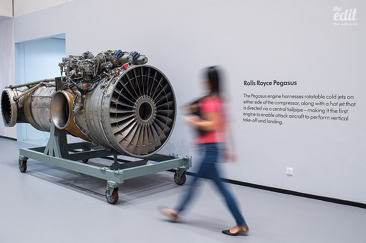 해리어 제트기는 인류 역사상 최초이자 유일한 수직 이착륙 전투기다. 영국이 만든 전투기로 엔지니어링의 상징 중에 하나다. 밥을 먹다가 이 엔진을 보고 영감을 얻으라고 전시해 놨다고 한다. 공대 출신들답다.