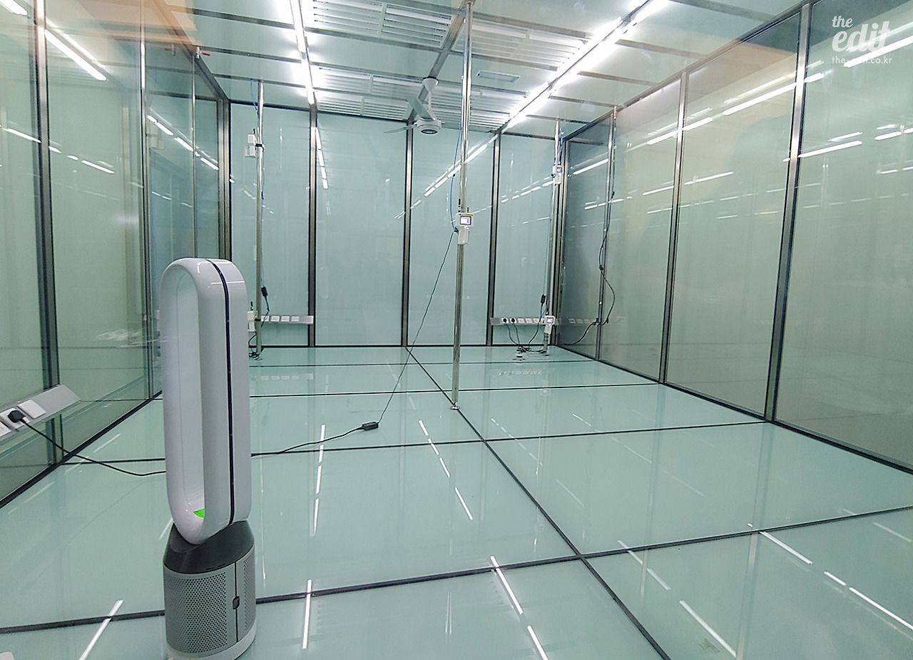 너무 많은 실험실을 열거하니 슬슬 지루할 것이다. 마지막으로 하나만 더 소개한다. 일반적으로 타 제조사들이 공기 청정기의 공기 정화능력을 실험할 때면 ‘CARD 테스트’를 실시한다. 3.2 x 3.7 x 2.4m로 약 12m2 정도의 작은 공간에 천장형 선풍기를 돌린다. 그리고 공기청정기를 돌리고 센서 하나로 변화되는 미세먼지양을 측정한다. 그런데 이 정도 공간은 대부분 아파트의 작은 방 크기 정도다. 게다가 일반 가정에는 천장형 선풍기를 돌리지도 않는다. 따라서 시중에 나온 공기청정기를 구입해도 성능이 기대에 못 미치는 경우가 많다.