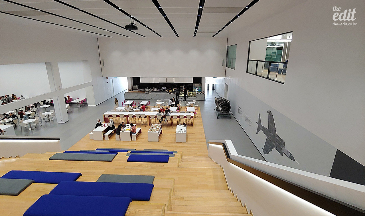그래도 내부에 들어가면 우선 넓은 카페가 보인다. ‘해리어 카페’라고 하는데 다이슨의 엔지니어들이 밥도 먹고 담소도 나누고 협업도 할 수 있는 공간이라고 한다. 그런데 그 공간 사이에는 갑자기 엔진 같은 조형물이 있다. 가까이 가보니 ‘해리어 제트기’의 엔진이라고 한다.