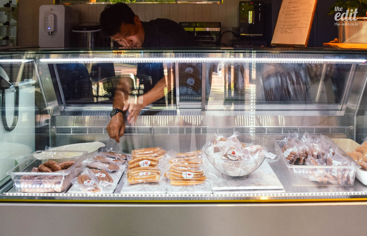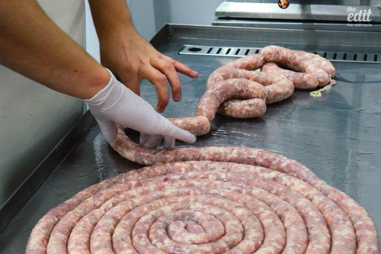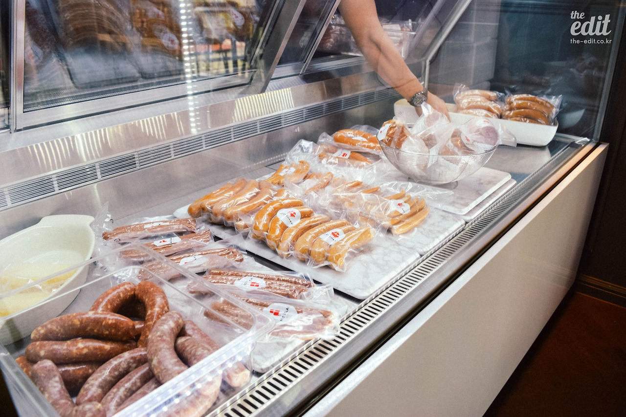 가게의 문을 열고 들어섰더니 기대하던 것과는 다른 풍경이다. 주렁주렁 투박하게 매달린 햄 묶음이나 커다란 다리 한 짝이 아니라 모던한 분위기가 나를 맞이한다. 샤퀴테리 초심자라도 길을 걷다 카페에 들어서듯 부담 없이 들어설 수 있을 것 같은 느낌이랄까. 동시에 머릿속에 떠오르는 물음표. 음, 소시지를 만들기에는 너무 세련된 공간인데. 다른 곳에서 만든 제품을 가져와서 팔기만 하는 건가. 그렇지만 이런 의구심은 이내 사라졌다.
