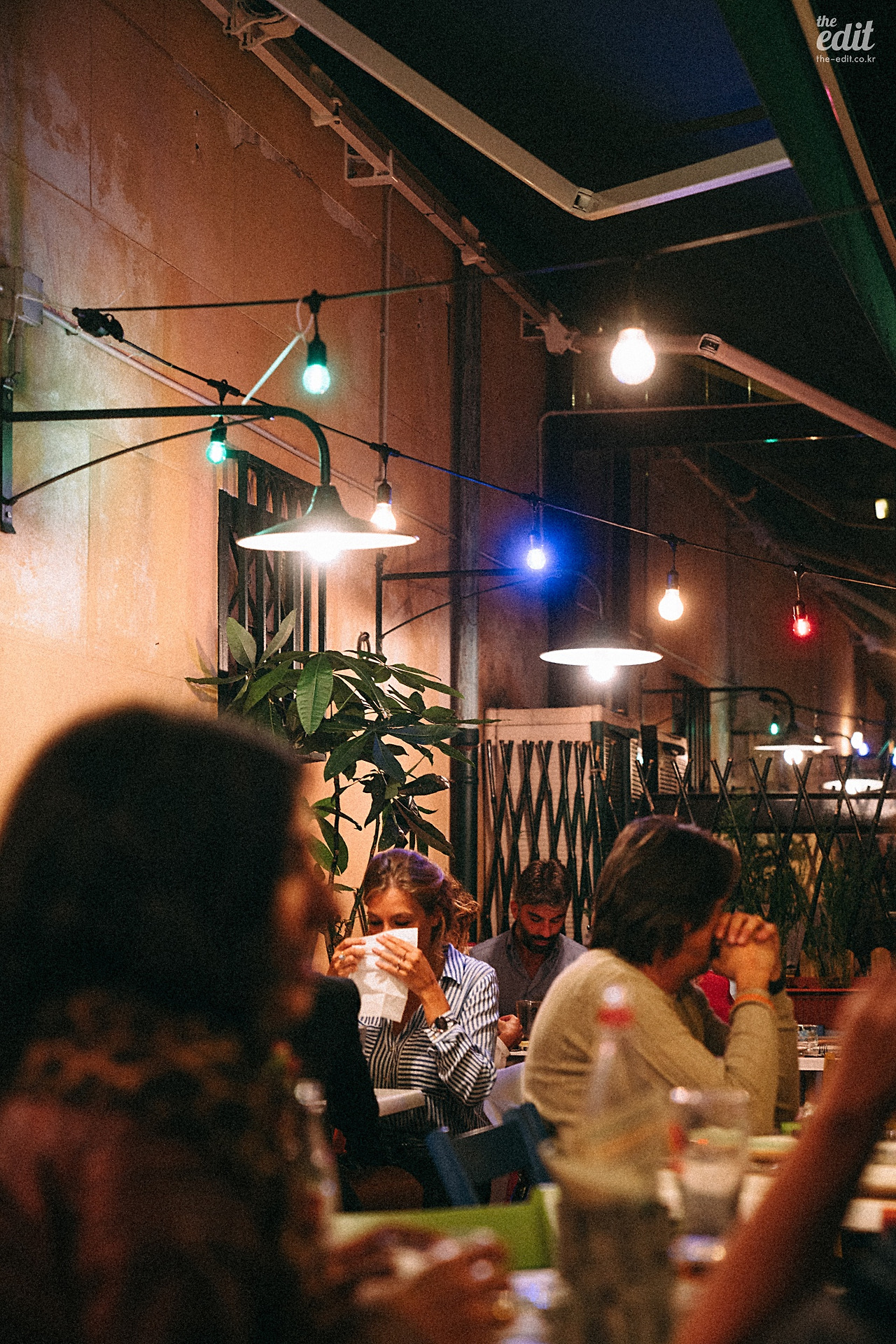 이 공간이 주는 바이브는 글이나 사진으로는 설명하기가 힘든데, 알록달록하고 촌스러운 요소들이 가득 모여 힙한 분위기를 뿜어내고 있었다고 말하면 여러분이 믿을 수 있을까. 우리가 식사를 시작한 지 얼마 되지 않아 가게 안은 다양한 옷차림의 젊은 힙스터들로 가득 찼다. 우리는 3일은 굶은 사람처럼 음식을 잔뜩 주문했다.