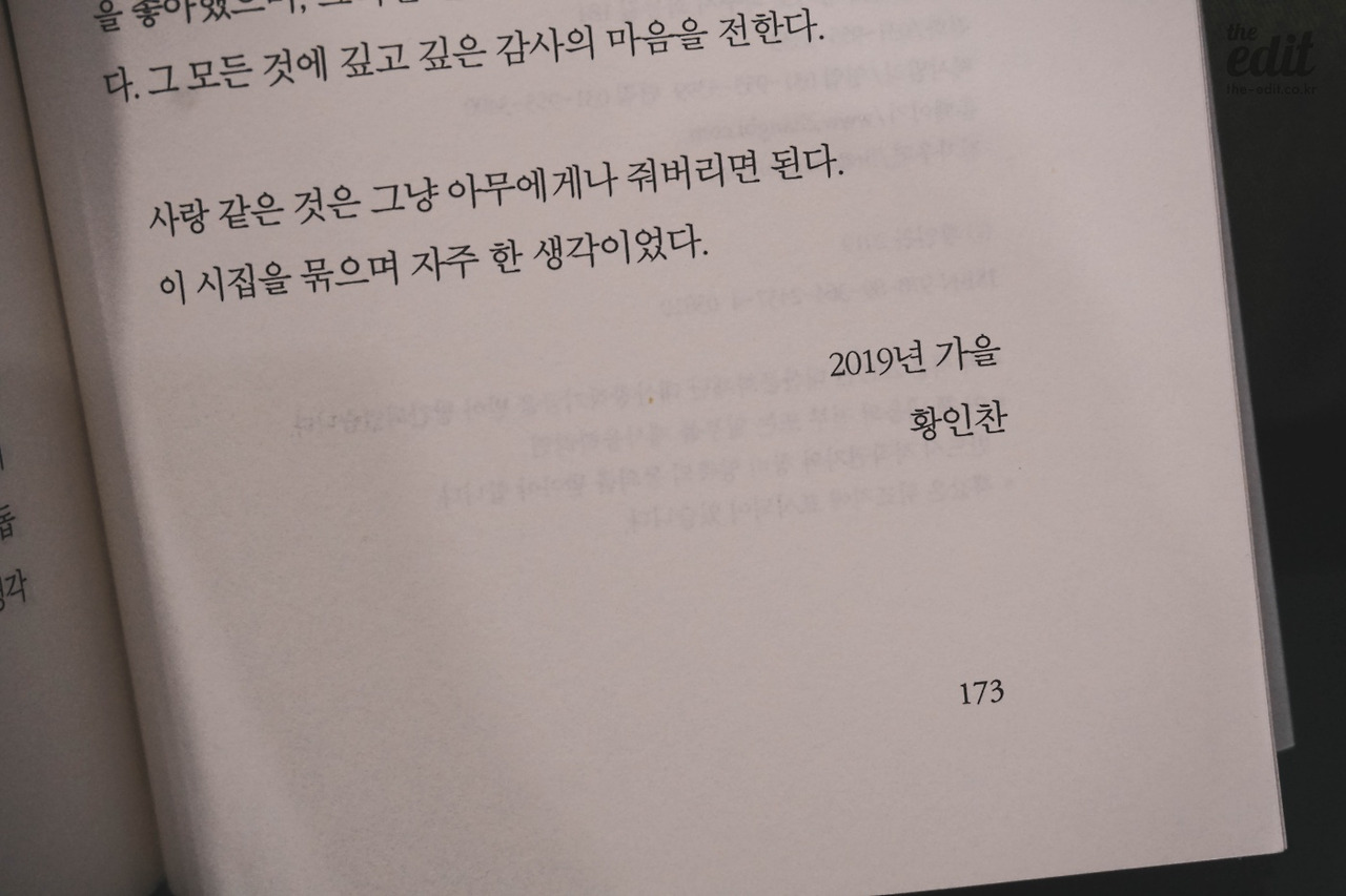 SNS에 시집을 찍어 올리니 친한 후배에게 바로 메시지가 왔다. “황인찬ㅜㅜㅜ 사랑시 천재ㅜㅜ시집 너무 좋죠ㅜㅜ” 맞다. 감각을 생생하게 끌어올리는 그의 시도 좋지만, 사실 사랑을 이야기하는 그의 문장들이 너무 좋지. 독백하듯, 쓸쓸하고도 의연하게. ‘사랑시 천재’라는 말에 조금이라도 궁금증이 인다면 시집을 직접 찾아보시라 꼭(!) 얘기하고 싶다.