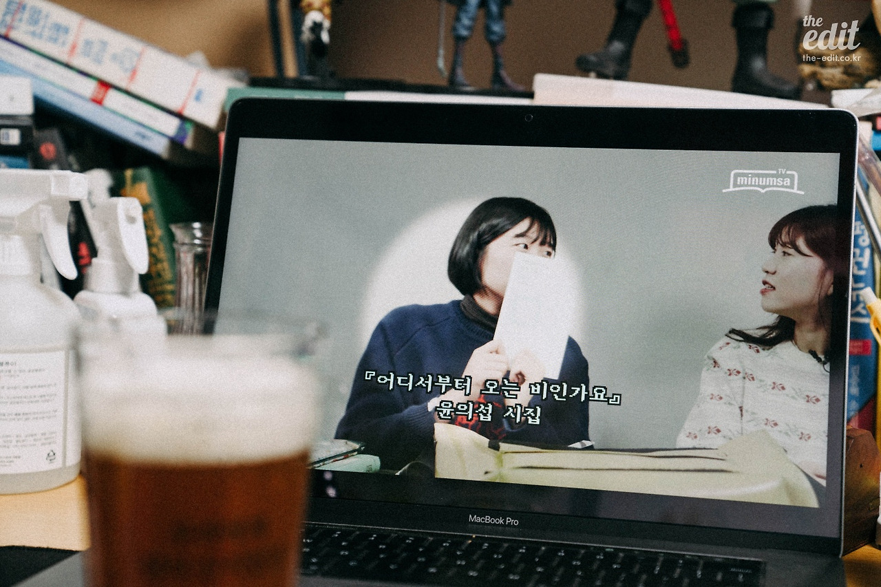 ‘민음사TV’는 요즘 계속 들어가게 되는 유튜브다. 출판사 민음사의 유튜브인데 나는 많은 영상 중 오직 ‘말줄임표’라는 시리즈만 본다. 주된 내용은 책의 디자인이나, 인생 책은 무엇인지 등 결국 책에 대해 떠드는데 나는 콘텐츠가 아니라 두 편집자의 케미 때문에 본다.