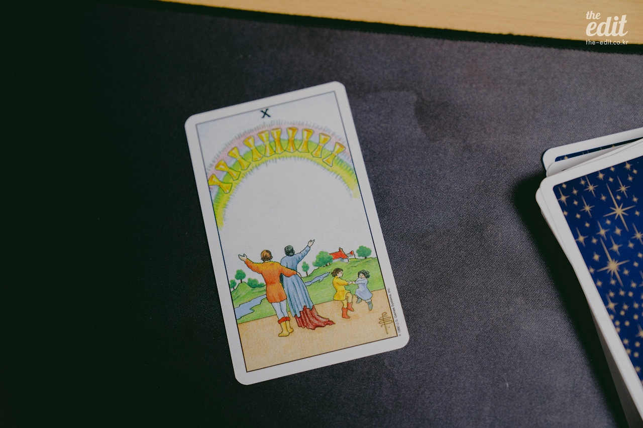 술은 마셨지만 취하지 않았다. 무알콜이니까. 하지만 마음은 살짝 젖어있는 상태. 직장, 연애, 돈에 대해 생각하다 보니 타로카드는 어떤 답을 줄까 궁금해졌다. 질문을 구체적으로 밝힐 수 없지만 연애에 대한 질문을 했다. 해석을 구체적으로 밝힐 순 없지만 좋은 의미다. 컵이 10개가 있는데 10은 완성을 의미한다. 그 아래에 아이들은 손을 잡고 기뻐하고 있다. 아이들이 기뻐하는 건 좋은 의미다. 이건 타로카드를 하나도 모르는 사람이 봐도 좋은 것처럼 보이지 않나?