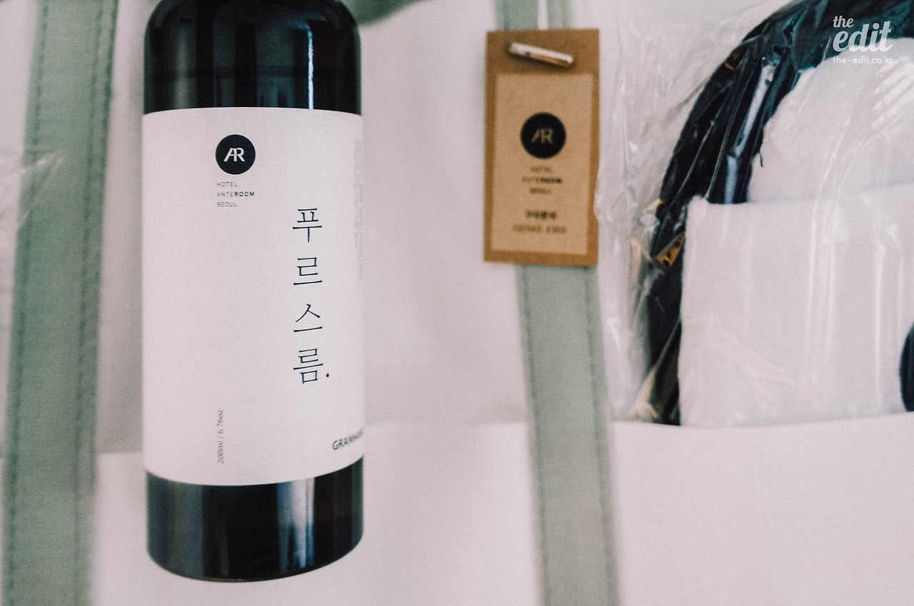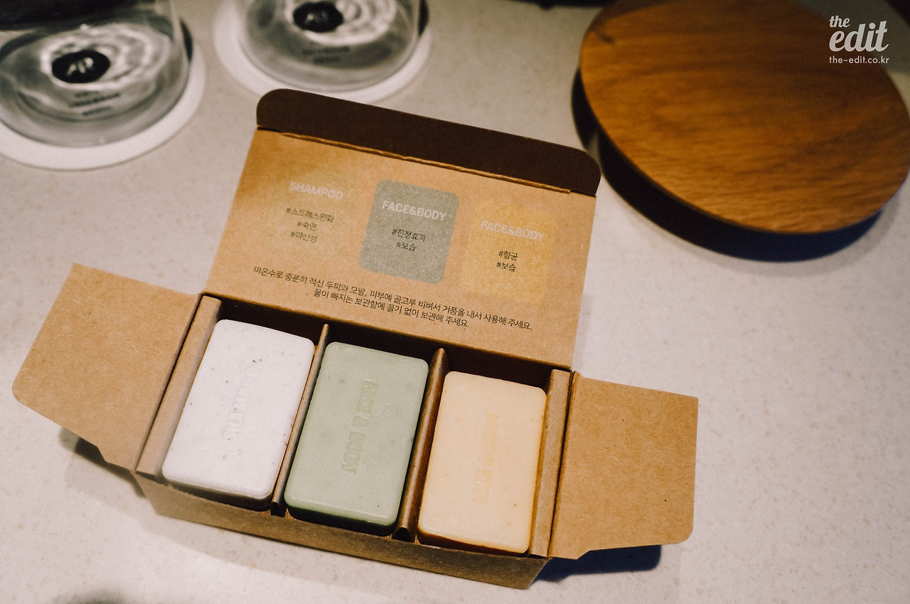 요즘 세계적인 호텔 체인들은 환경 보호에 동참하는 차원에서 일회용 어메니티를 없애거나 친환경 소재로 바꾸는 중이다. 안테룸 역시 플라스틱 튜브 제품 대신 세 개의 비누를 비치해 두었다. 샴푸바는 처음 써봐서 거품이 잘 날까 싶었는데 향도, 거품도, 세정력도 만족스러웠다. 거기에 환경보호에 기여하고 있다는 약간의 뿌듯함까지. 역시 ‘에코-프랜들리 이즈 더 뉴 블랙’이다.