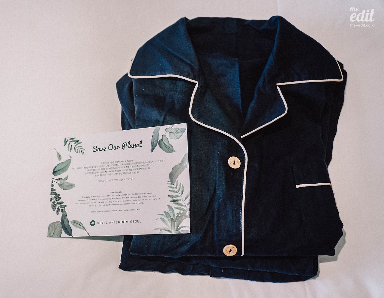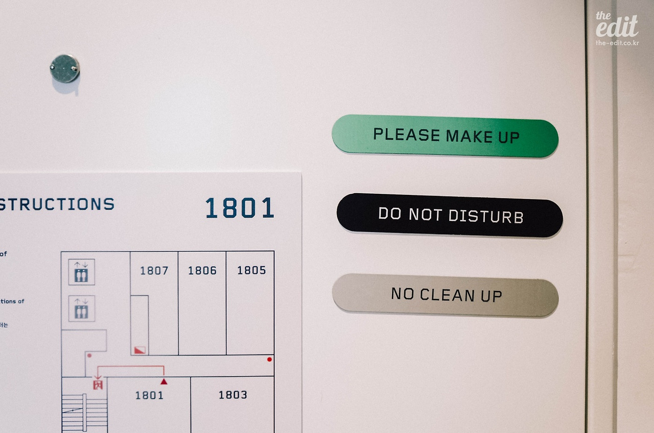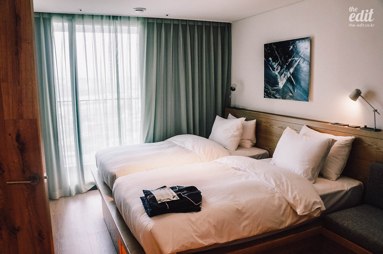 룸 곳곳에 센스있는 아이템들이 숨어있다. 룸 스프레이와 파자마 같은 것들. 편백나무향의 룸 스프레이는 틈틈이 룸에 칙칙 뿌렸다. 작은 공간에 푸른 내음이 가득 퍼지면서 갑자기 숲 한가운데 있는 듯한 착각에 빠지기에 충분하다. 네이비 색의 면 파자마는 어찌나 보들보들 착 감기는지. 처음 발을 들인 낯선 공간을 집처럼 편안하게 느끼게 만들어준 일등공신이다.