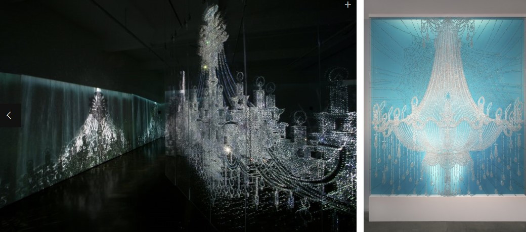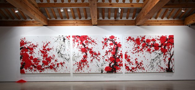 늦은 나이에 도전한 유학, 그리고 그곳에서 9/11 사태를 겪으면서 아르바이트를 하던 자수 업체의 무수히 쌓여 있던 단추로 작품활동을 시작하였습니다. 하나의 작품을 완성하기 위해서는 수 만개의 단추를 벽에 박고 또 박아 궁, 부처, 샹들리에, 매화 등의 작품을 만들어 냅니다. 작품 하나를 완성하기 위해 일일이 단추 구멍에 핀을 꽂아 망치로 두들기는 수행과도 같은 작업을 통해 이제껏 만날 수 없었던 새로운 작품을 탄생시킵니다. 매화 시리즈에서는 만개한 매화로 단추가 변하고, 샹들리에 시리즈에서는 곧 우수수 떨어질것만 같은 화사한 보석처럼 빛이 납니다.