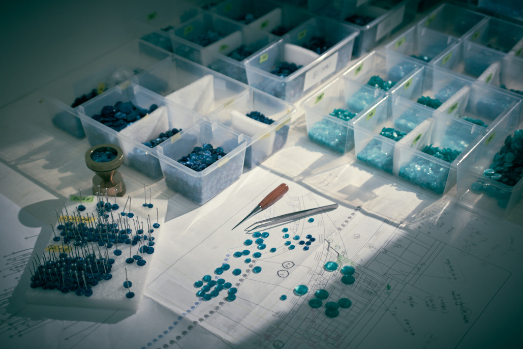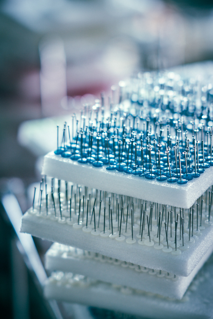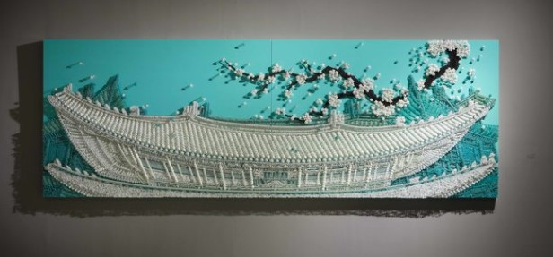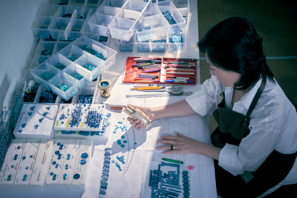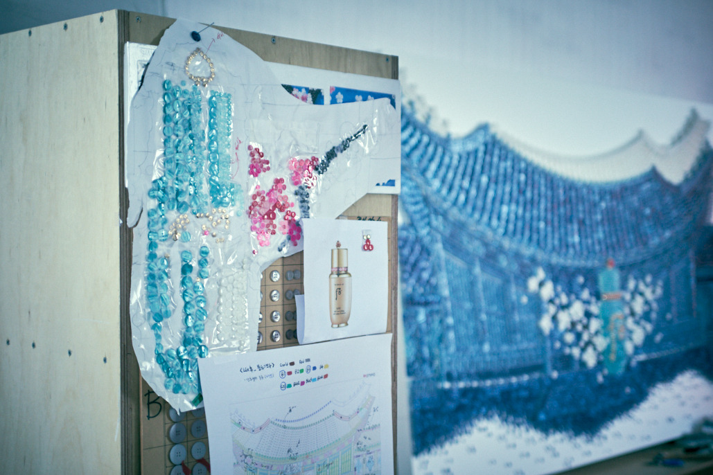 단추의 위치, 높낮이, 크기가 다다르게 정확한 위치에 자리잡아야 한다고 합니다. 그리고 염색한 단추들을 배열해 하나씩 핀으로 고정합니다. 고정할때는 망치로 1개의 단추를 수십번 쳐는 과정을 반복해야하며 작품 하나를 만들려면, 망치질 몇천만번을 몇억번을 하는 고난의 과정을 거쳐야 한다고 합니다.