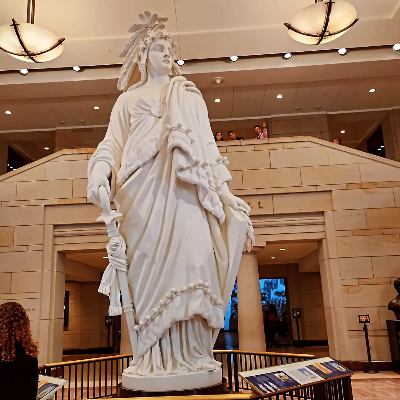 뉴욕의 자유의 여신상과 달리 워싱턴 D.C. 의 자유의 여신상(Statue of Freedom)은 투구를 쓴 채 허리춤에 칼을 차고 손에는 월계관과 방패를 쥐고 있다. 자유는 거저 주어지는 것이 아님을, 칼과 방패로 싸우며 의지와 힘으로 지켜내야 한다는 뜻이리라.
