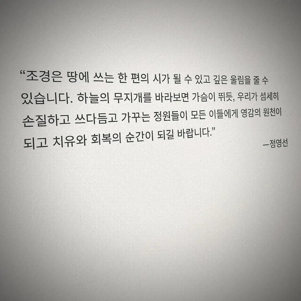 사실 지난 5월, 유퀴즈에 출연했던 그녀의 방송을 보고 깊은 인상을 받았더랬다. 하지만 그 무렵 첫 책 발간과 사업 준비로 몹시 분주했던 탓에 그냥 지나치고 말았다. 그리고 며칠 전, 그녀의 전시를 다녀온 분의 인스타 포스팅 속에서 '조경은 땅에 쓰는 한 편의 시'라는 문구를 발견하고서야 전시회에 대해 알게 됐고, 무려 4월부터 시작해 약 6개월여에 걸쳐 진행된 전시의 종료가 얼마 남지 않았음을 알게 됐고, 참으로 다행이라 생각했다.