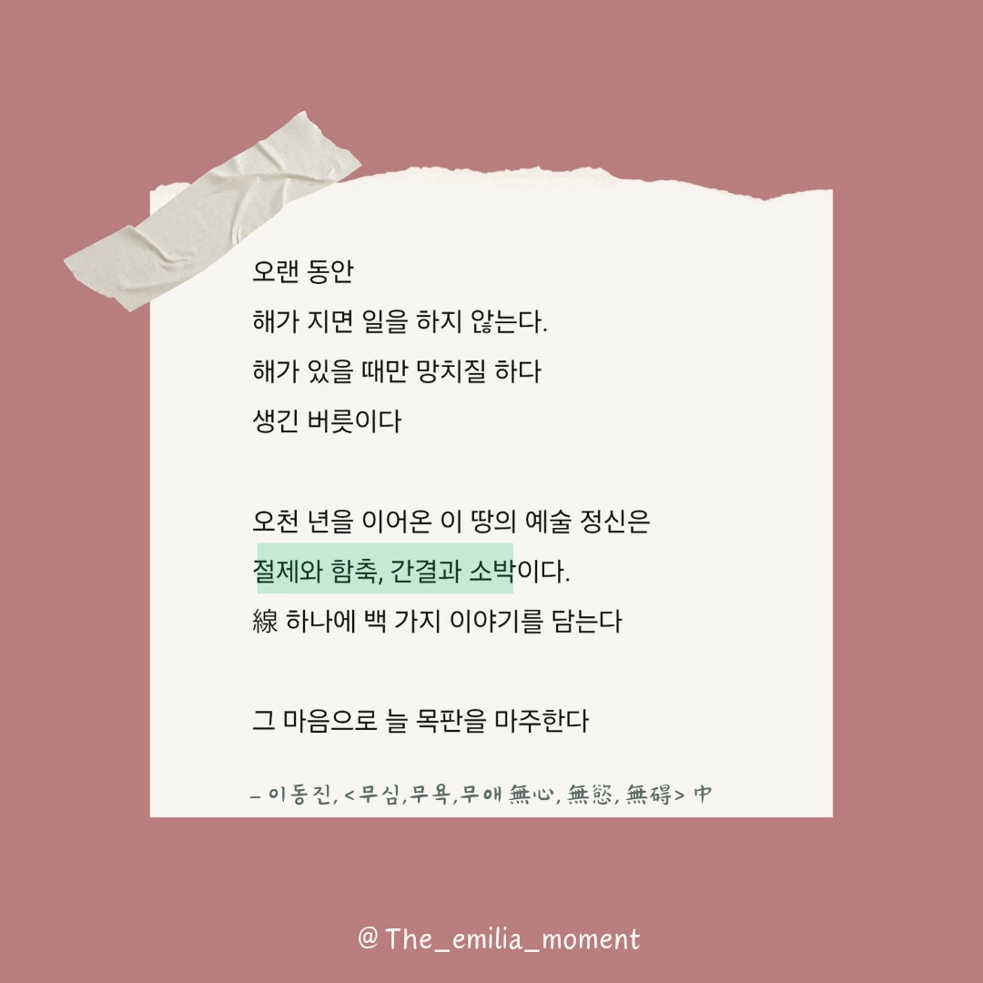 오랜동안해가 지면 일을 하지 않는다.해가 있을 때만 망치질하다생긴 버릇이다 오천 년을 이어온 이 땅의 예술 정신은절제와 함축, 간결과 소박이다.線 하나에 백 가지 이야기를 담는다그 마음으로 늘 목판을 마주한다 - 이동진 <무심, 무욕, 무애 無心, 無慾, 無碍> 中