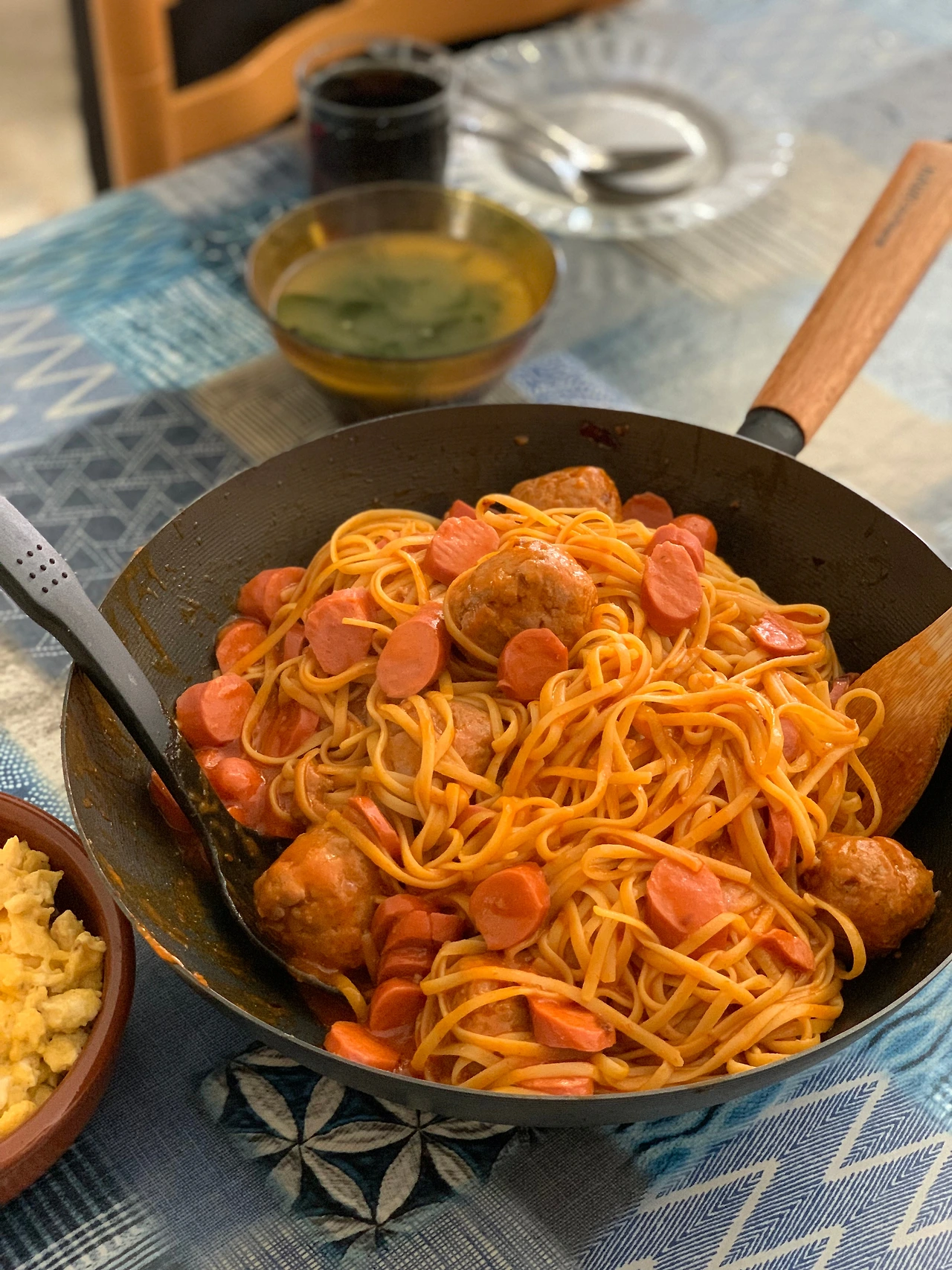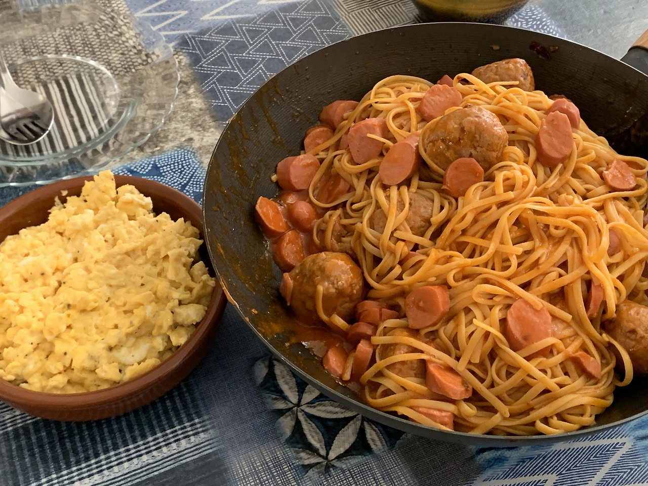 엄청난 양의 파스타와 미트볼과 계란까지.