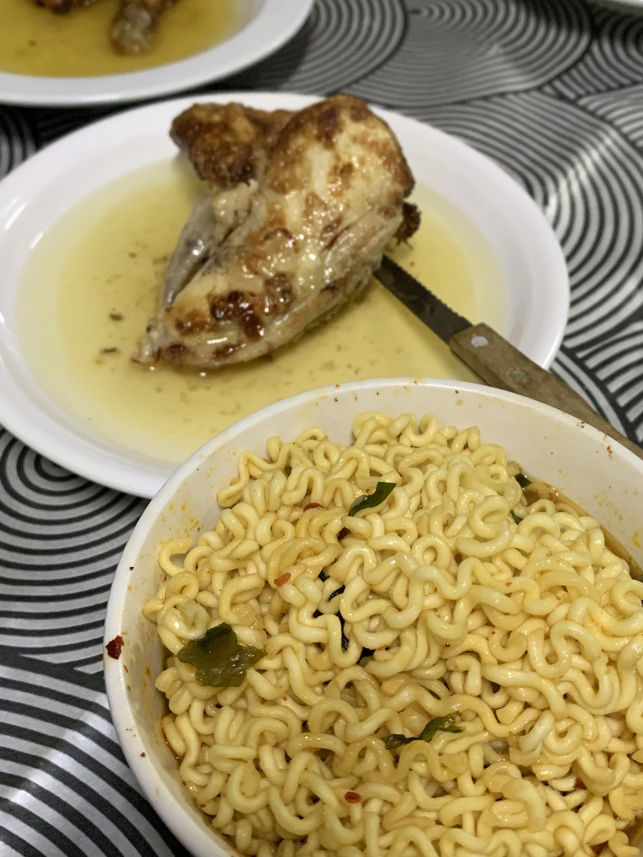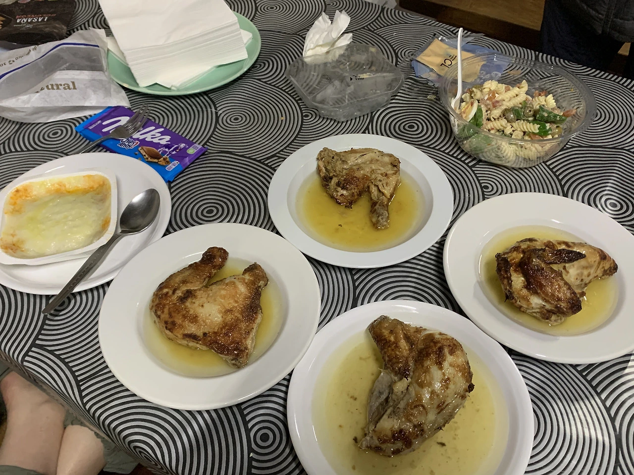 단백질 함량이 엄청날 것 같은 닭고기를 공동으로, 각자 샐러드와 라자냐와 라면을 곁들였다.