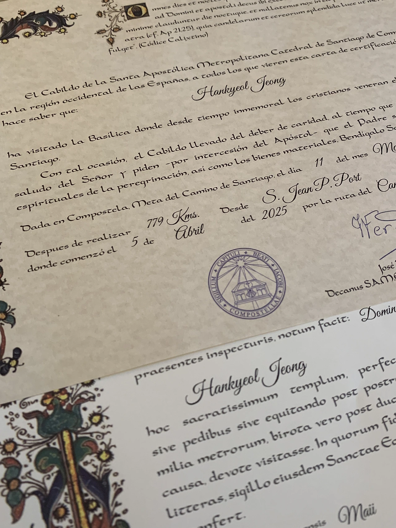 컴퓨터에 출발한 곳을 입력하고 크레덴셜 확인을 받으면, 생장 피에드포르부터 779km를 걸었다는 인증서를 받을 수 있다.