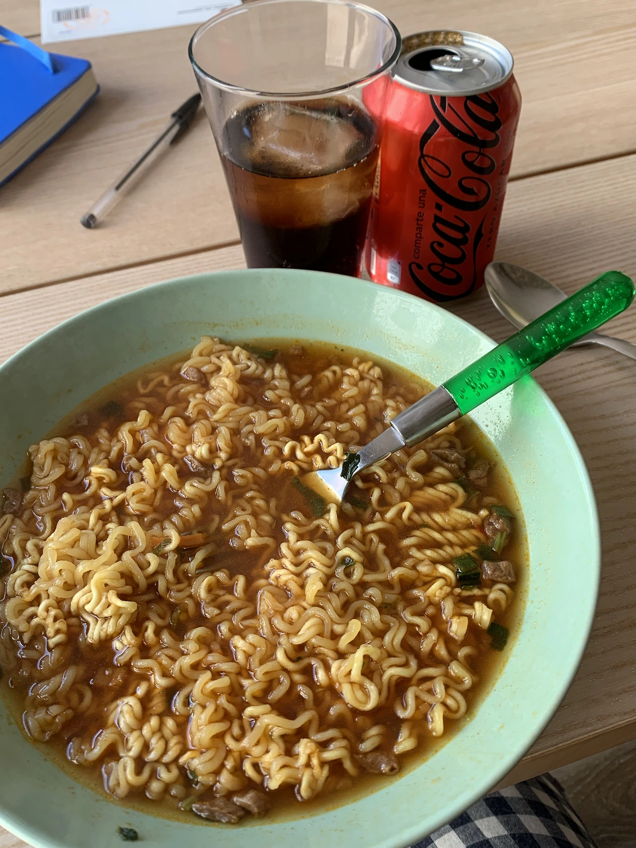 너무 힘들어서 밥을 사 먹을까 생각도 했지만, 안 그래도 늦은 스페인의 저녁시간까지 기다릴 힘도 없었기에 그냥 산티아고에서 산 라면을 전자레인지로 끓여 먹었다.