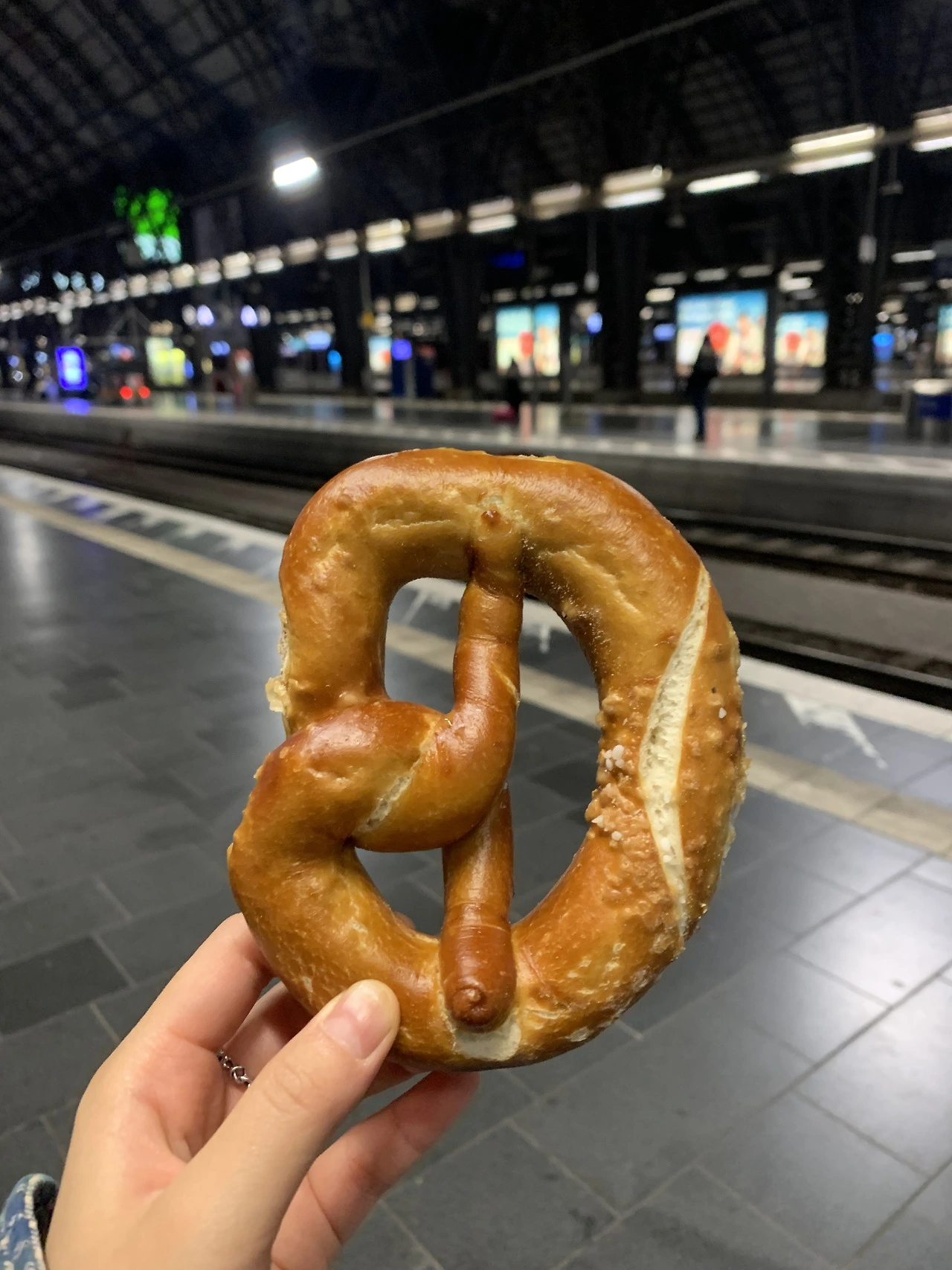 전날 슈퍼에서 산 프레첼을 먹으며 기차를 기다렸다.