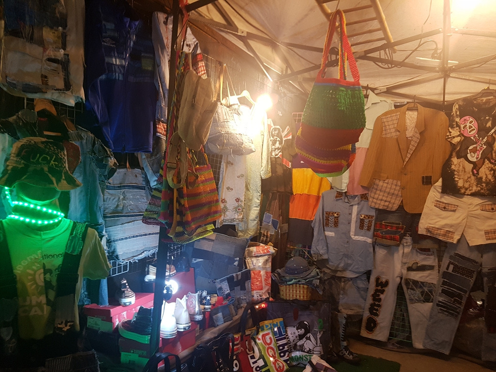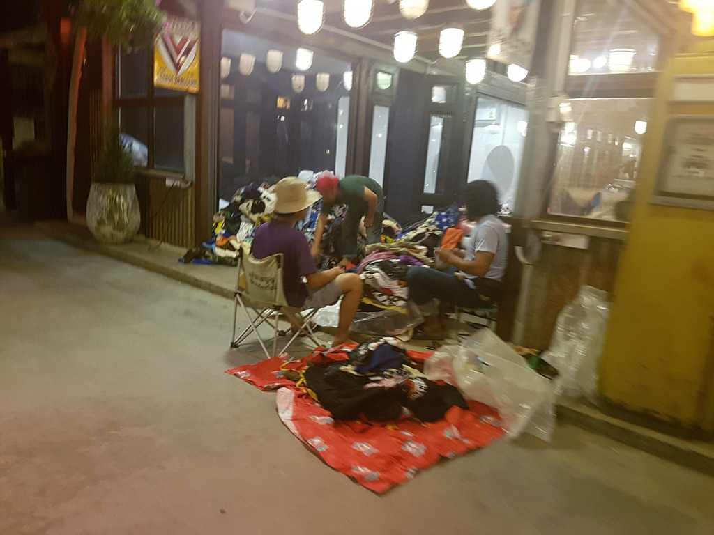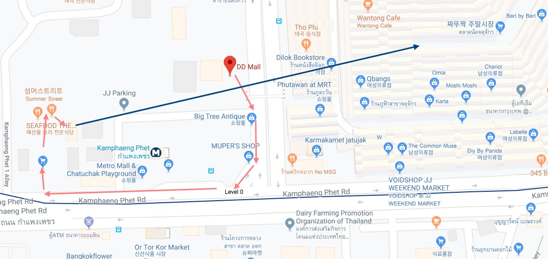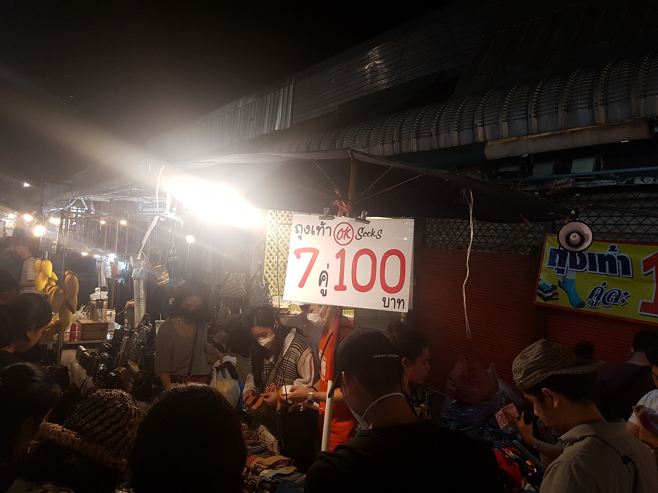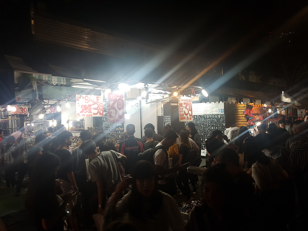 다 먹고 나니 10시30분쯤이 되었다. 여기까지가 핑크색 화살표이고, 소화시키자며 다시 짜뚜짝시장 쪽으로 걸어갔더니 짜뚜짝주말시장에서 여는 짜뚜짝나이트마켓이 한창이었다. 금, 토 밤 12시까지 한다고. 현지인이 많은 마켓이라 짜뚜짝주말시장보다 더 저렴하게 하는 물건들도 있었다. 아래 사진이 밤 11시 사진인데, 사람이 이렇게나 많았다. 짜뚜짝나이트마켓은 원래 있던 가게에서 여는 집도 있지만. 문 닫은 가게 앞에 천막을 치고 장사를 하는 사람들이 더 많았다.