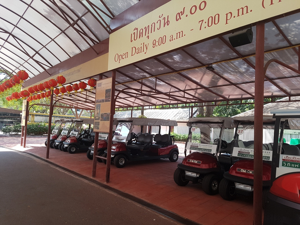 입장권에 포함되어 있는 트램은 2시간에 한 번씩 다니니 시간 맞추기가 힘들다. 자전거는 그 더위에는 웰컴 투 헬이다. 무앙보란의 규모가 1280제곱킬로미터이니 자전거면 다니다가 말수가 점점 줄어들 것이다. 우리는 골프 카트 4인용 2대 빌렸다. 1대당 1시간에 350밧. 15분 이상 초과하면 1시간 요금을 낸다. 우리는 두 시간 꽉 채워서 700밧 쓰는 게 목표였고 지켰다.