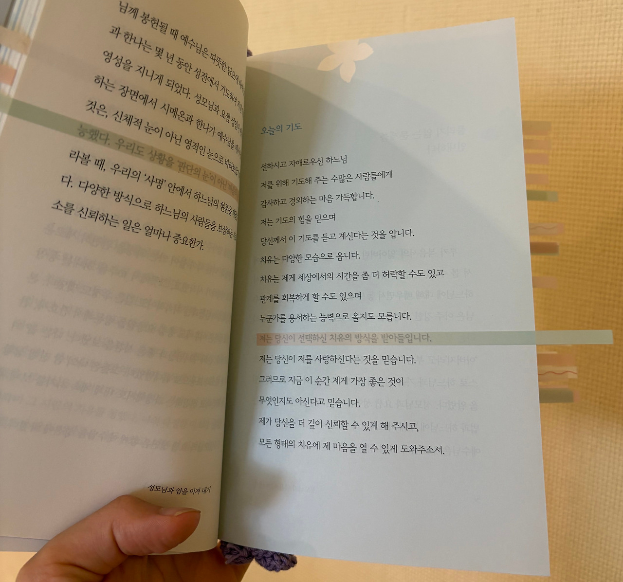 - 읽게 된 계기: <기도의 ABC>와 함께 명동 성당에서 데려왔다. 루치아 수녀님 책을 둘러보는 와중 어쩔 수 없이 눈에 띈 제목에 운명처럼 나에게 와서 많은 위로와 힘이 되어주었다.