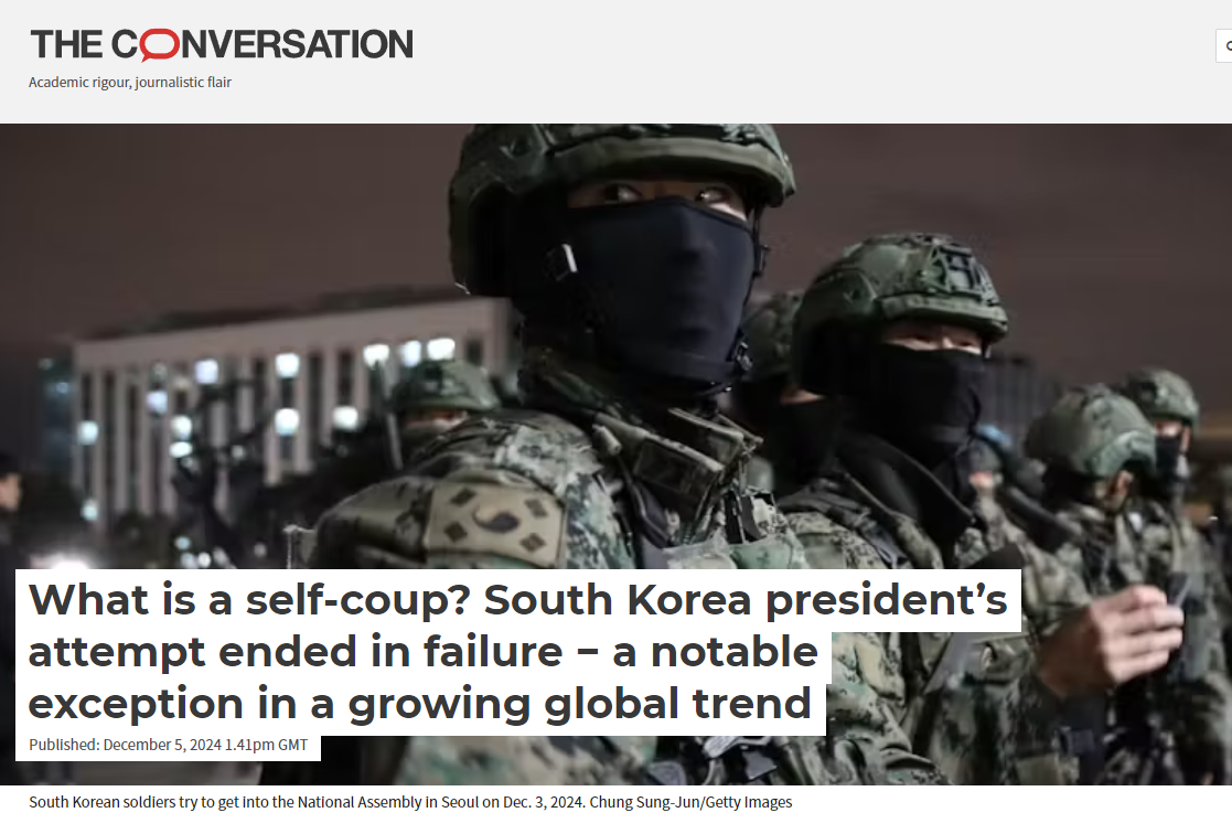 제가 그렇게 찾은 사이트 중 하나는 The Conversation입니다. 대학이나 연구기관 소속 학자들이 최신 시사 현안에 대한 설명 혹은 분석을 기사의 형태로 제공하는 곳으로, 신뢰로운 필진과 친절한 기사 내용이 장점입니다. 오늘자 The Conversation의 첫 면에는 전 세계가 당혹스럽게 주목하고 있는 한국의 정치 상황에 대한 독자들의 이해를 돕고자 '친위(親衛) 쿠데타(self-coup)'가 무엇인지에 대해 미국 교수 두 분이 친절하게 설명해 주는 기사가 올라왔네요...