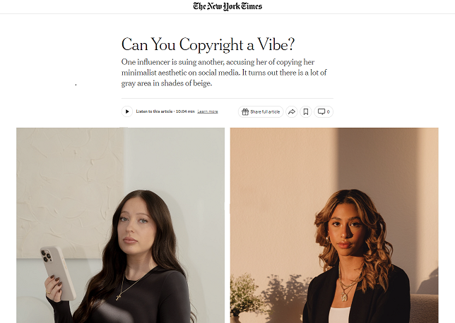 The New York Times도 제가 참고하는 뉴스 사이트 중 하나입니다. 오늘자 New York Times의 첫 화면을 가볼까요. “분위기에도 저작권을 설정할 수 있을까?(Can you copyright a Vibe?)”라는 흥미로운 제목이 눈에 띄네요. 소셜미디어의 발달에 따라 창작의 정의도 달라지고 있는 시대적 배경을 바탕으로, 저작권의 범위 변화에 대한 흥미로운 탐구를 해볼 수 있을 것 같아요.