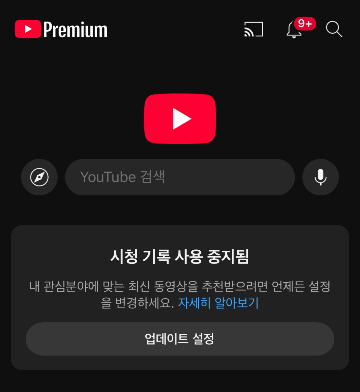 이를 모두 끝내고 이제 다시 유튜브 앱을 다시 열면 짜잔! 초기화된 홈화면이 나온다.