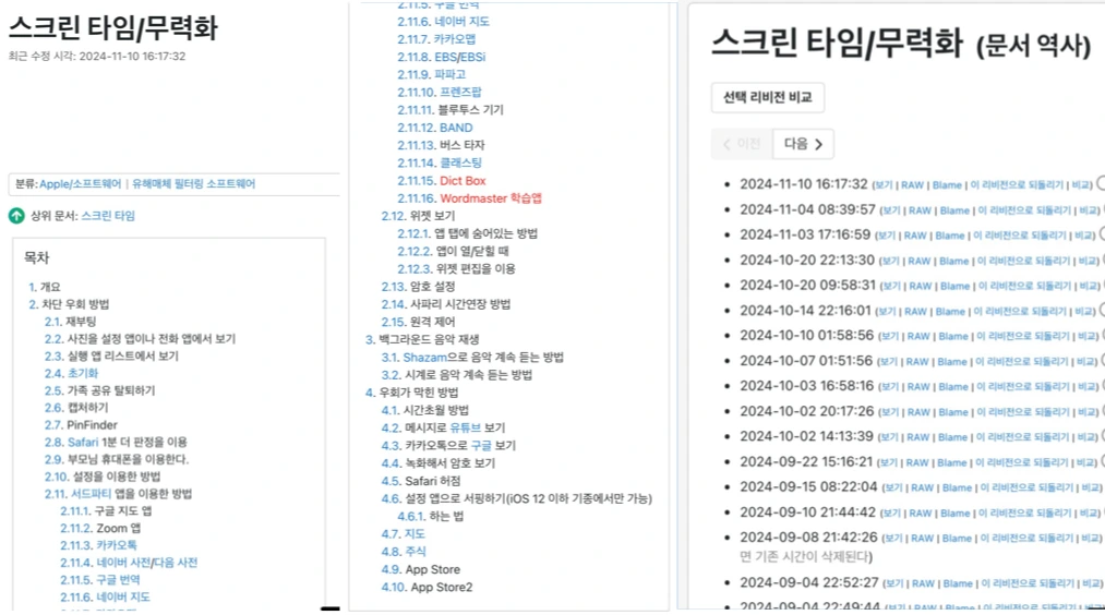 항목 하나 하나 읽다보면 우리 아이들의 창조적 역량에 정말 입이 딱 벌어진다. 엄마 아빠가 고심해서 설정한 각종 제한을 기어이 뚫어내고야 마는 과제 집착력. 생각도 못해본 수십가지의 우회 방법들에서 창의력이 반짝 반짝 빛난다. 논문을 써도 될 정도로 치밀하고 깊은 사고력. 집단 지성의 힘으로 대동단결하는 협업 능력. 불과 하루 전에 이뤄진 마지막 문서 수정의 내용은 “토스앱으로 유튜브 보기”였다. 여러분, 우리의 자녀들의 탐구력은 지금 이렇게 쓰이고 있습니다.
