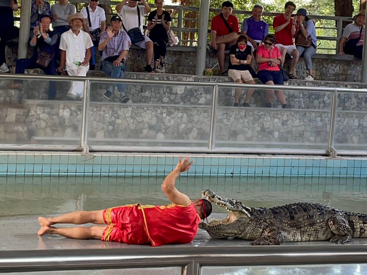 파타야에서의 마지막행선지는 악어농장이었다. 한국인 관광객이 꽤나 자리 잡고 있었고 공연이 시작되었다. 보는 내내 동물의 왕국에서 봤던 물면 비틀어버리는 악어의 습성이 생각났다. 다행히 숙련된 공연자의 솜씨 때문인지 공연자의 팔이 비틀리는 일은 없었다.