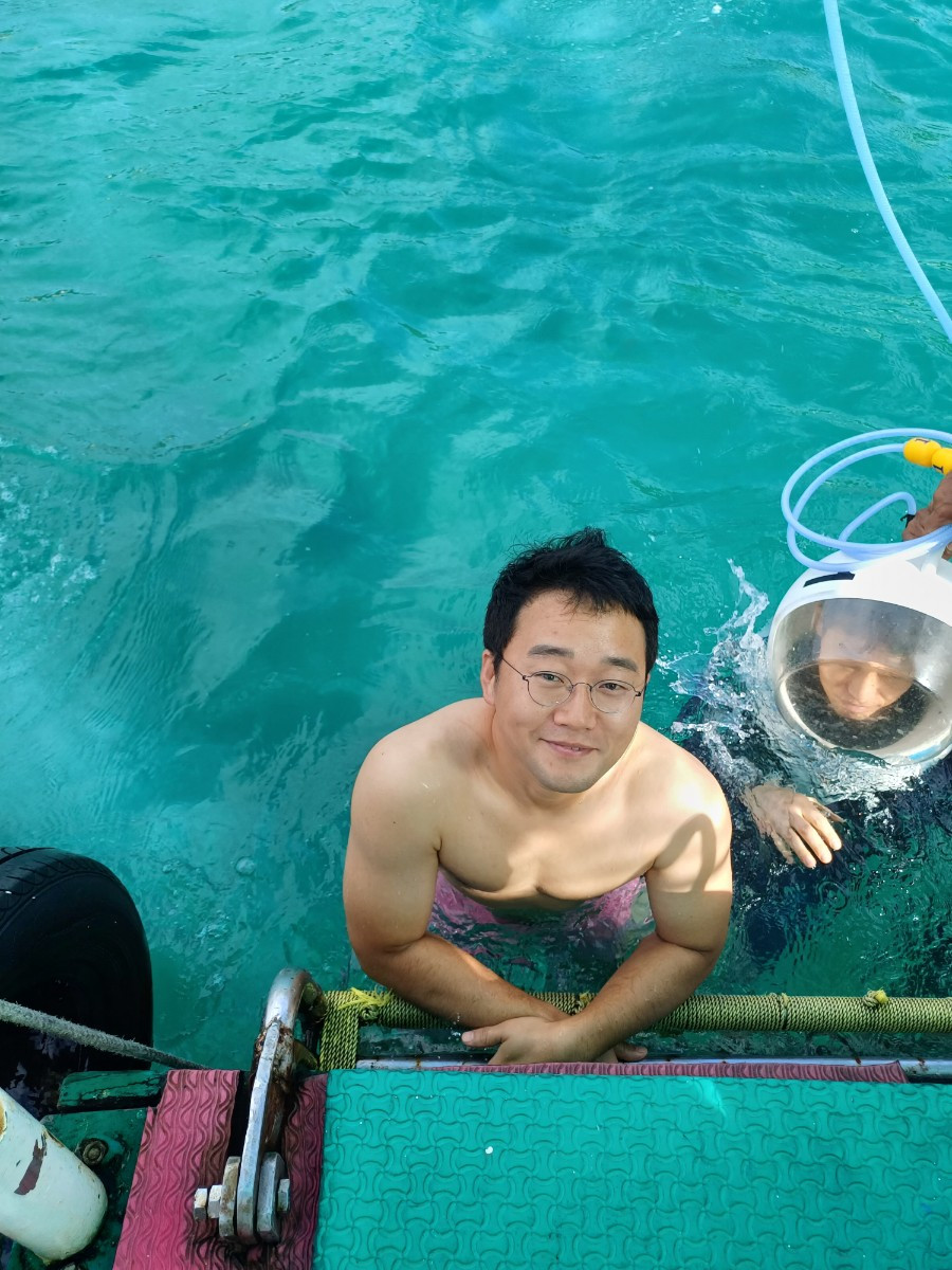 회사 직원 2명과 70살 정도 되어 보이는 중국인 관광객 8명이 씨워킹하는 곳으로 갔다. 들어가기 전에 장비를 보았는데 그냥 머구리에 물호수로 공기를 계속 주입하는 방식으로 보였다. 덜컥 겁이 났지만 눈앞에 펼쳐질 푸른 바다와 산호 그리고 유유히 노니는 물고기를 생각하며 들어갔다.