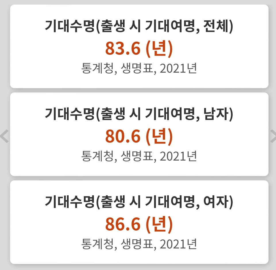 통계청 국가통계포털 KOSIS(www.kosis.kr)의 '생명표' 자료에 의하면, 2021년의 0세 나이 기준 한국인 전체 기대수명(출생 시 기대여명)은 평균 83.6세라고 한다.(남자는 80.6세, 여자는 86.6세라는데 남녀 간 기대수명이 6년이나 차이 나는 것을 직접 확인하고 새삼 놀람.)