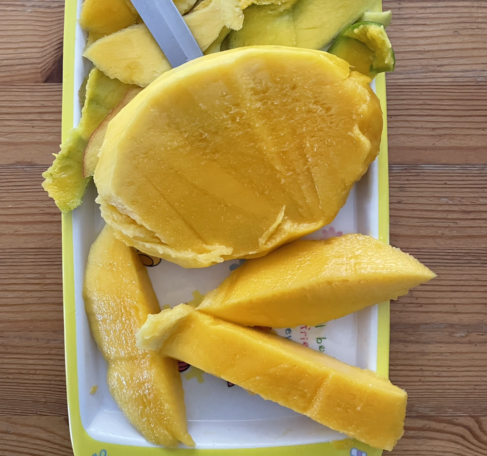 그래서 망고 정중앙이 아니라 살짝 비켜난 부위로 (망고 씨앗이 칼에 걸리지 않게) 자릅니다.
