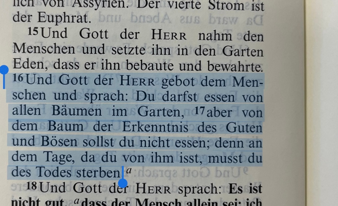 이 동산에 있는 나무 열매는 무엇이든지 마음대로 따먹어도 된다. 그러나 선과 악을 알게 하는 나무 열매만은 따먹지 마라. 그것을 따먹는 날, 너는 반드시 죽는다.