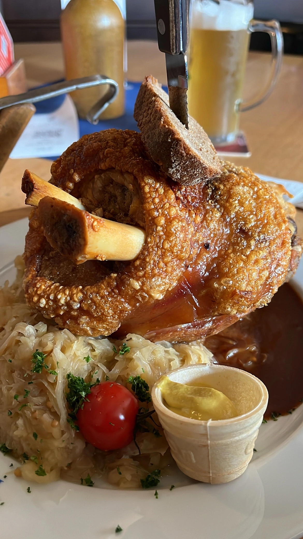 *crisp grilled Schweinshaxe with sauerkraut & bread
