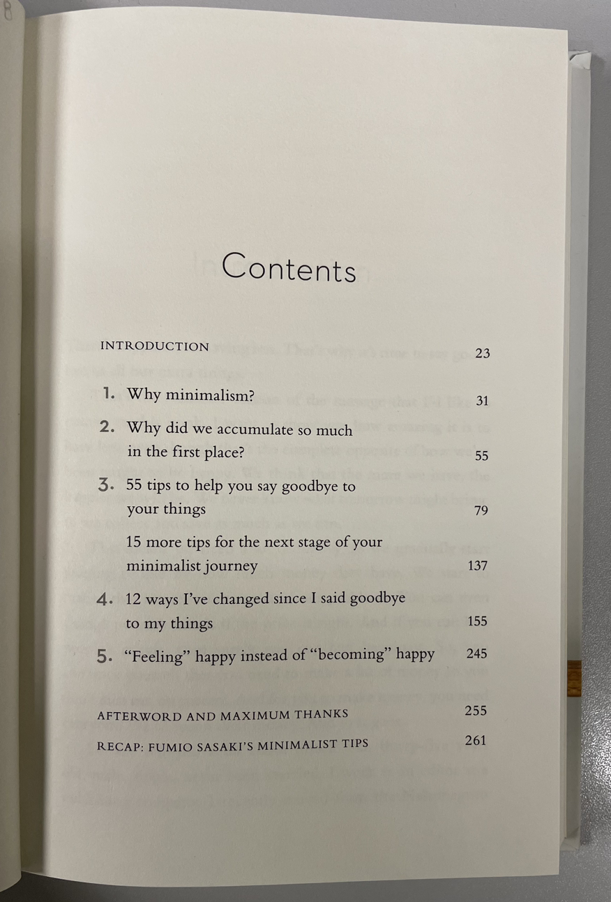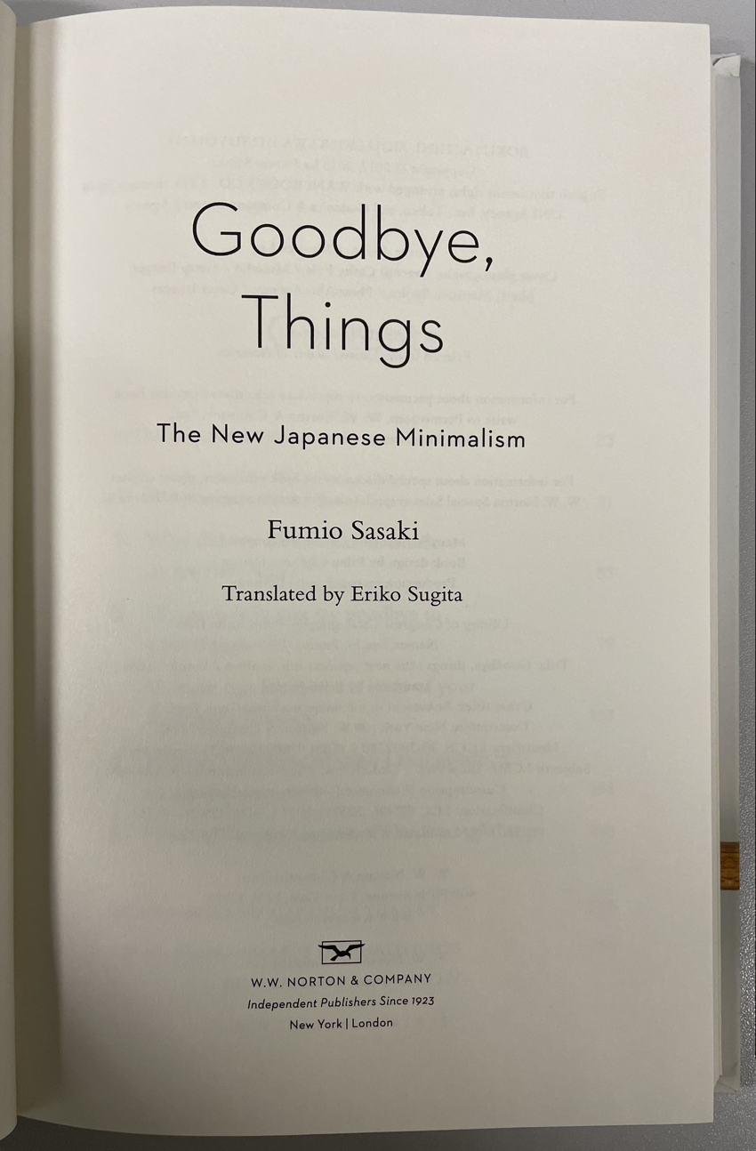 이러한 열풍으로 인해 (당연한 결과겠지만) 독자분들도 이미 다 잘 아시는 바와 같이 이 분야에 관한 많은 글들과 책들이 쏟아져 나왔고 오랫동안 베스트셀러 목록에 올라간 책들도 많았다. 필자도 이렇게 유행처럼 번지고 있는 Minimalism에 관심을 갖고 좀 들여다보게 되었는데 그중 눈에 띄는 책 하나가 바로 아래의 [Goodbye, Things](2017) by Fumio Sasaki(원서 일본어의 영문 번역본임)이었다.