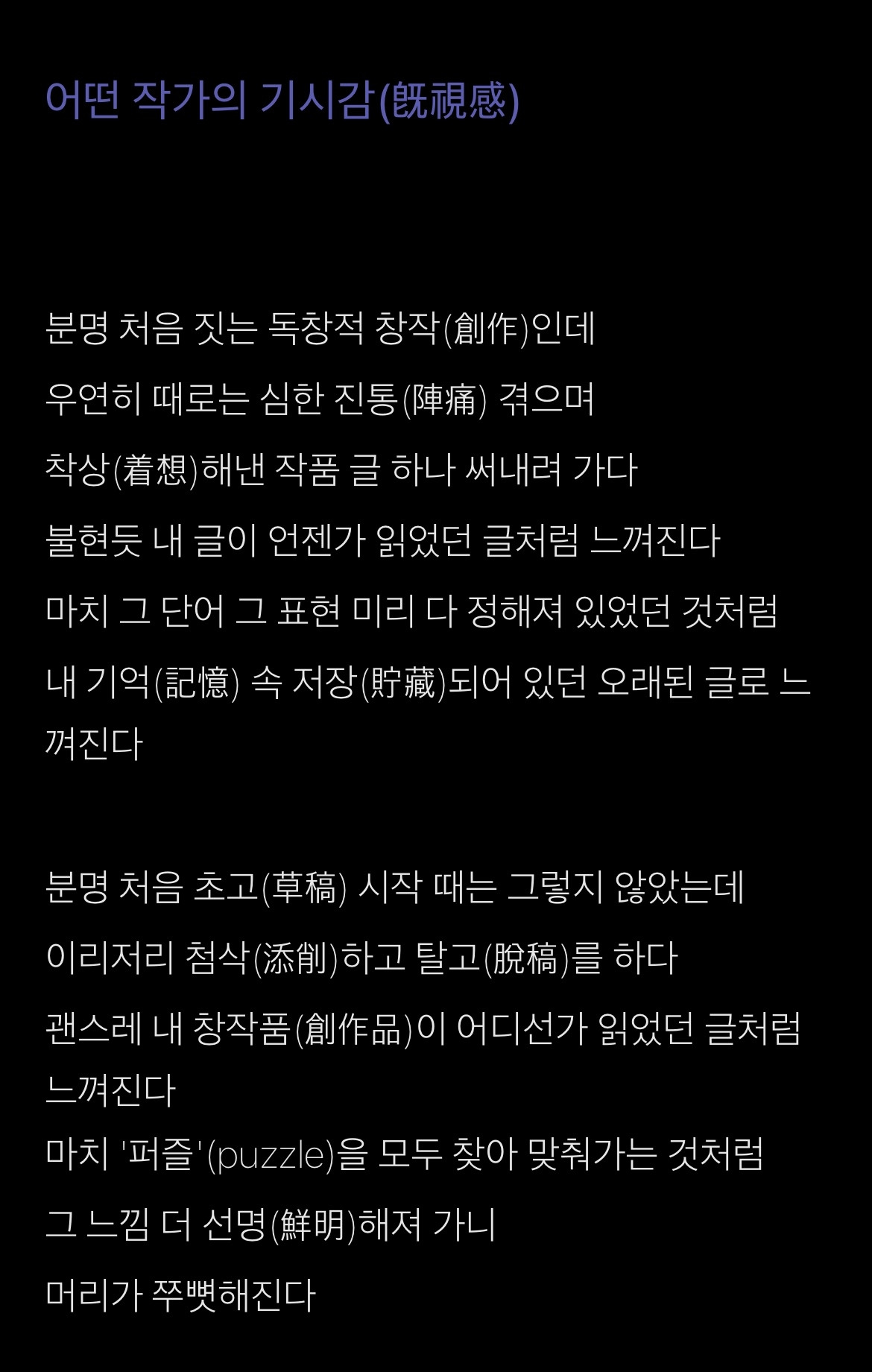 필자가 직면한 문제는 발행한 글을 다시 읽어보면 여전히 해소되지 않는 묘한 기분이 들 때가 있다는 사실이다. 내가 글을 쓰면서 수차례 반복해서 읽고 또 읽으며 익숙해져서 그런 것인지는 모르겠지만 문득 피어오르는 어떤 "기시감"(旣視感)으로부터 완전히 자유롭지 못하다는 생각이 종종 들기 때문이다.