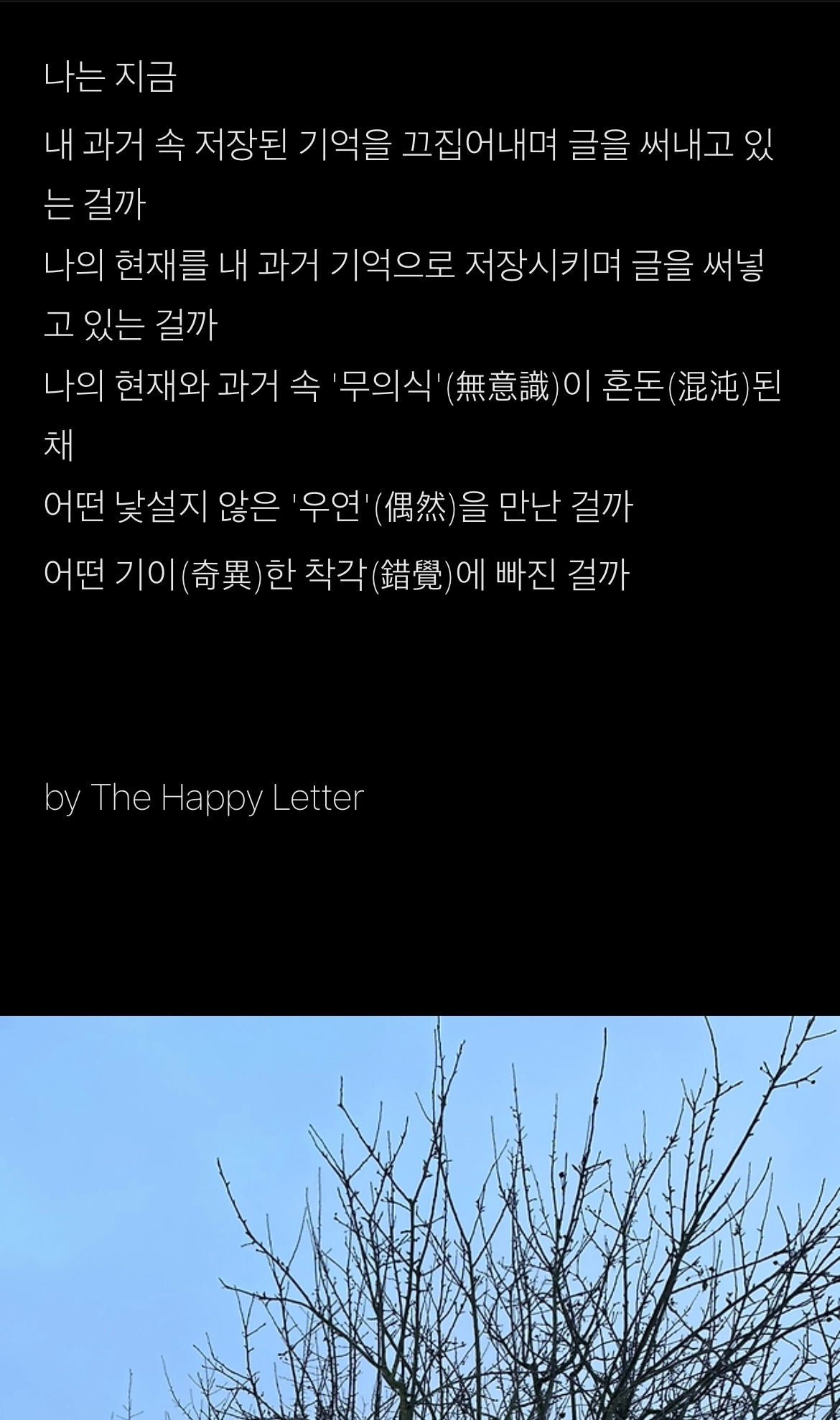 지나친 강박? 글쎄, 그렇게 물어도 할 말은 없다. 하지만 무릇 타인 표절뿐만 아니라 '자기 표절'도 엄연히 표절이기에 조심스러울 따름이다. 이런 물음과 의심을 반복하고 있는 나는 이 묘한 '느낌'으로부터 언제쯤 완전히 자유로울 수 있을까?(필자는 이 이슈와 테마로 이미 앞서 몇 편의 에세이와 아래와 같은 시를 발행한 적도 있다.)