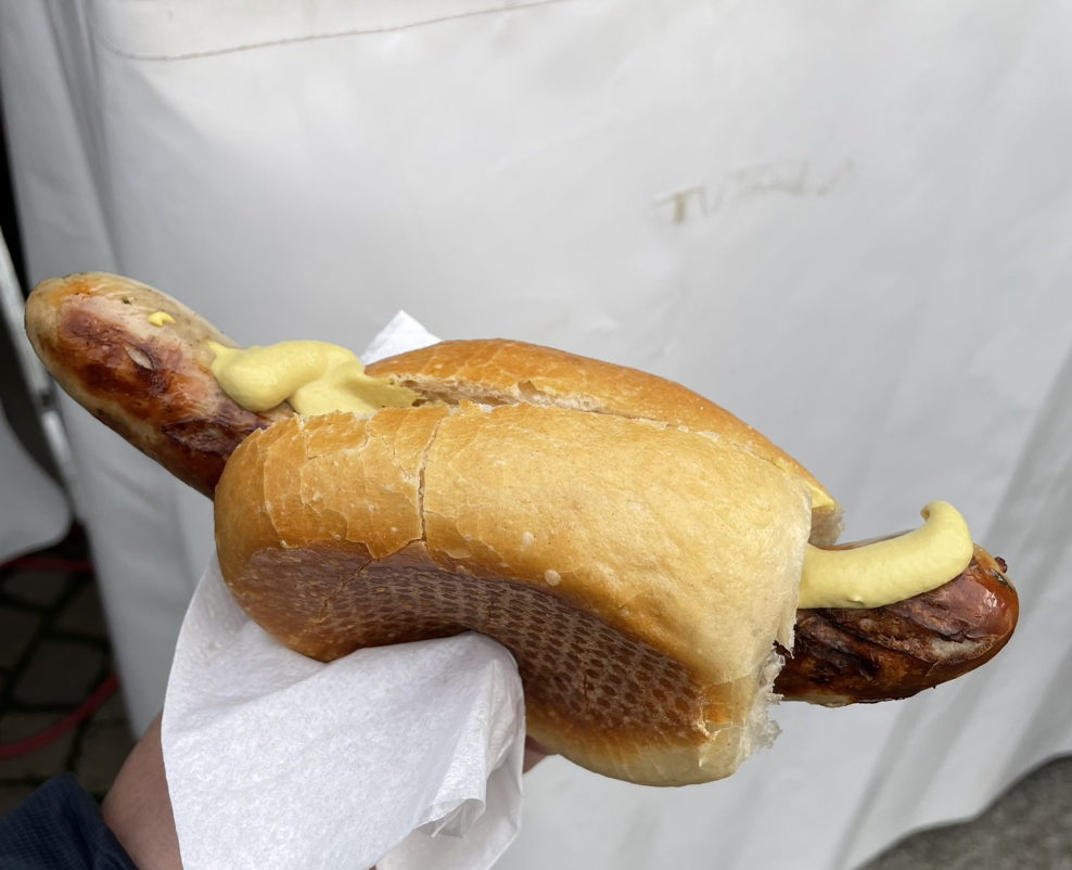 방금 구운 뜨거운 소시지에 소스로 아래 사진처럼 독일 [Senf](mustard)를 함께 얹어 먹으면 맛이 아주 '예술'이다. 이 구운 독일 소시지 맛은 아마 어디에 있건 오래도록 잊지 못할 것 같다.(취향에 따라 케첩을 택할 수도 있고, 소시지가 살짝 짭조름하기 때문에 소스 없이 빵과 그냥 먹어도 맛있다.)