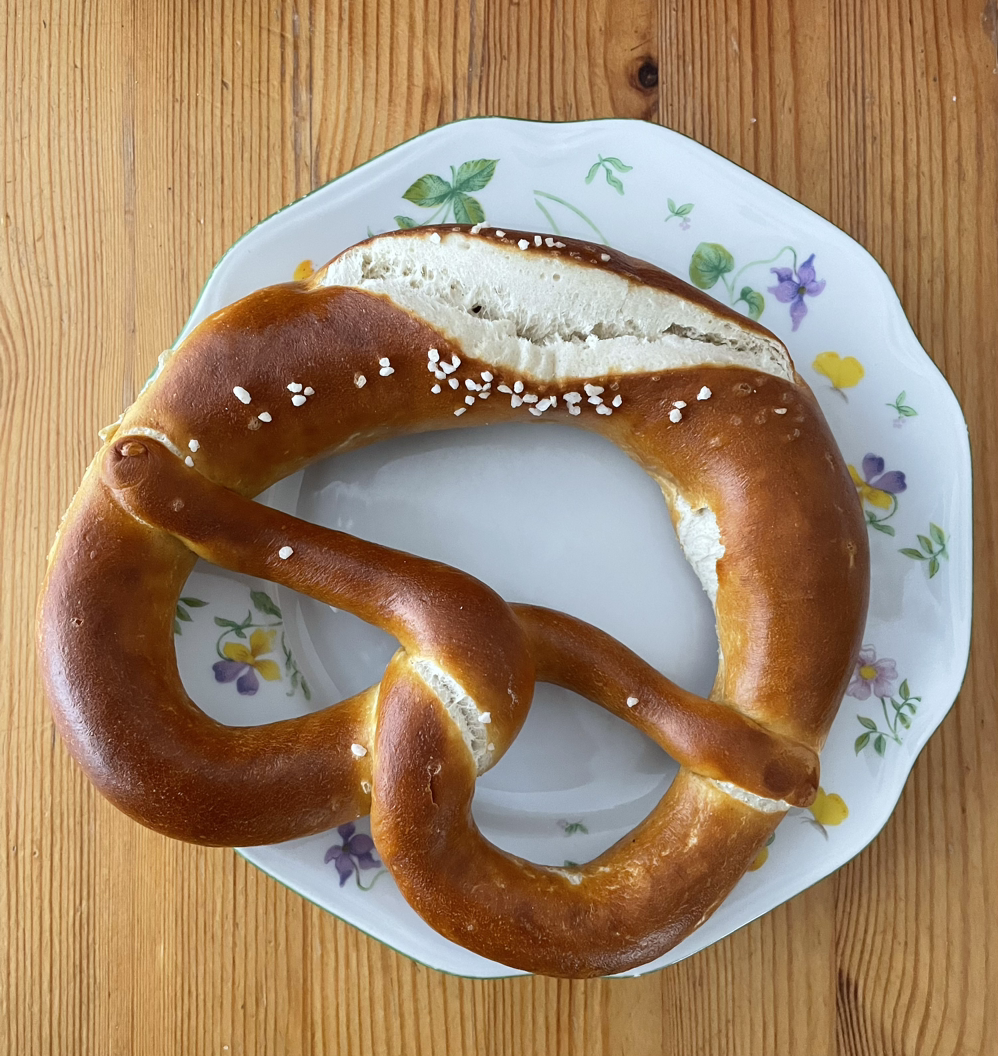 아래 사진은 잘츠브레첼[Salzbrezel](salted pretzel)이며 빵 위에 토핑(topping)으로 하얗게 묻은 것이 소금이다. 먹을 때 목 막힘을 줄여주고 출출할 때 간식으로 그냥 먹어도 좋지만 맥주와 함께 먹기도 아주 좋다.