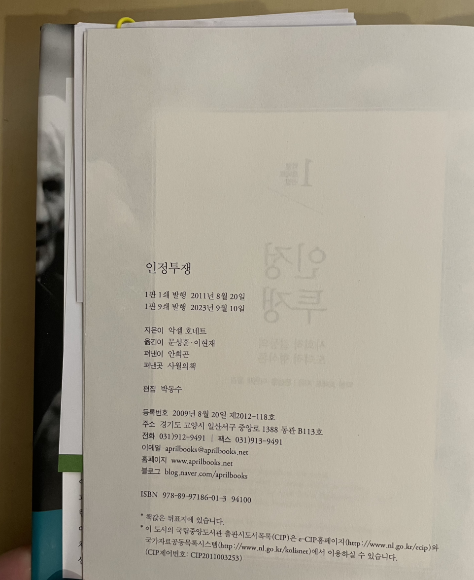 그 책이 바로 철학자 '악셀 호네트'(Axel Honneth)가 쓴 [인정투쟁]이었다.('사월의책' 출판, 문성훈• 이현재 옮김. 한글 번역본 초판 2011)