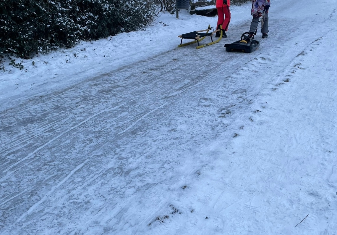 동네 비탈진 눈길 위