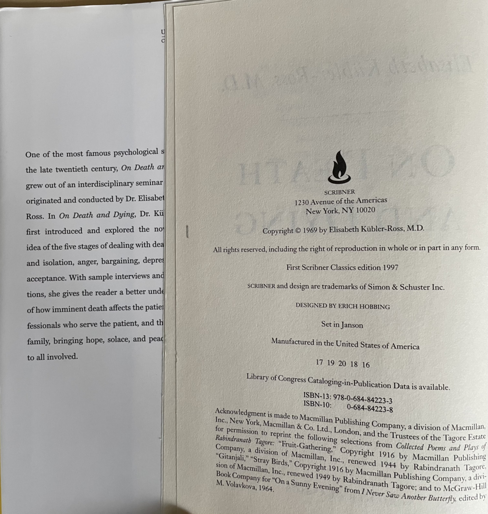 책장을 정리정돈하다가 엘리자베스 퀴블러 로스 박사(Dr. Elisabeth Kübler-Ross)의 대표작인 『On Death and Dying』(1969)을 선정하여 여기 올려둔다. 한글 번역본은 『죽음과 죽어감』이라는 제목으로 출간되어 있다.