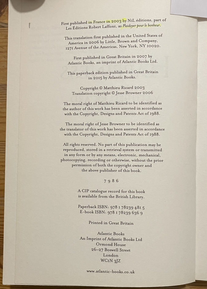 그가 쓴 책들 중 크게 주목받는 책으로는 [The Monk and the Philosopher], [Altruism] 등 많지만 오늘은 [Happiness : A Guide to Developing Life's Most Important Skill](Atlantic Books. UK 2015)이라는 책을 이 매거진에 기록해 둡니다. 2003년 프랑스에서 [Plaidoyer pour le bonheur]로 출간되었으며 한글 번역본은 『행복, 하다』(현대문학 2012)라는 제목으로 나와 있습니다. 평소 ‘행복’ 그리고 ‘행복한 삶’에 관심 있는 분들에게 흥미로운 행복론이라고 생각되어 인상 깊은 몇 대목도 인용해 아래에 덧붙입니다.(광고 아님)