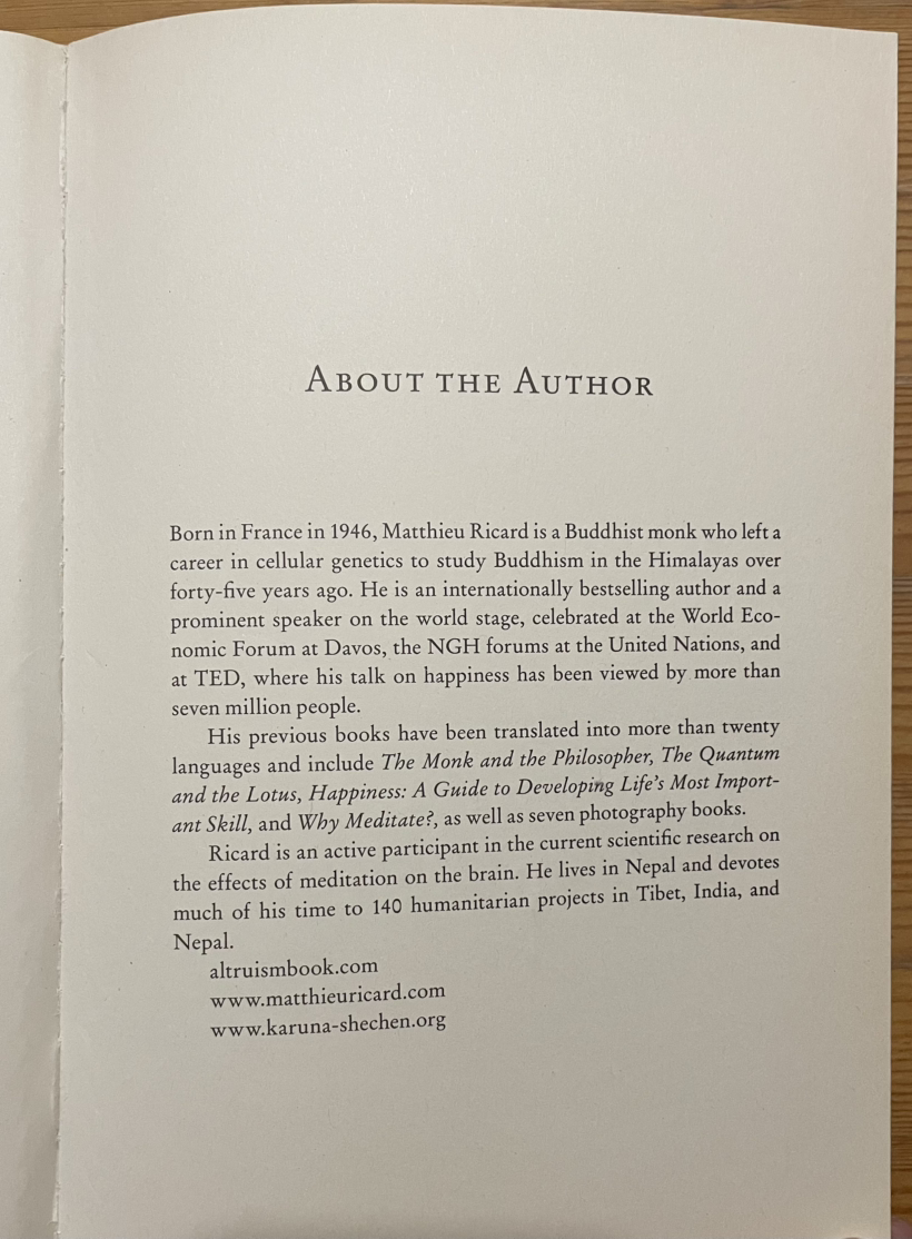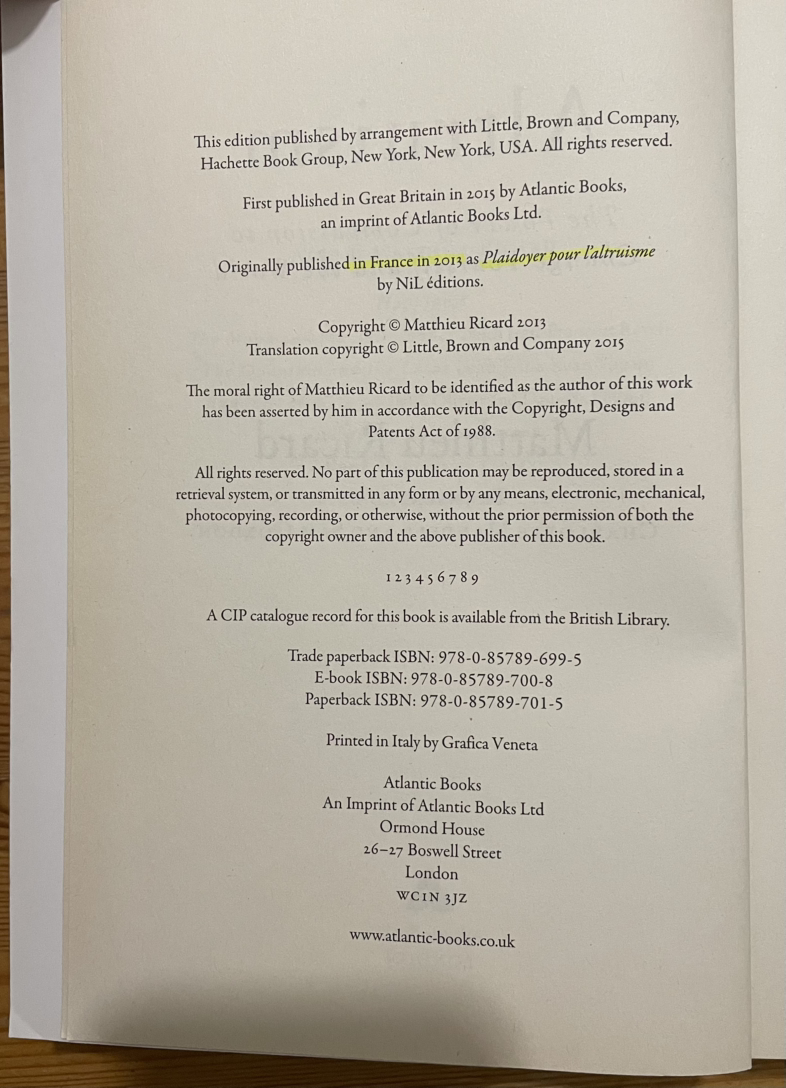 [Altruism]은 2013년 프랑스어로 첫 출간되었으며 영문 번역본(Atlantic Books, UK 2015) 기준, 총849쪽에 이를 만큼 분량이 다소 많은 두꺼운 책입니다.