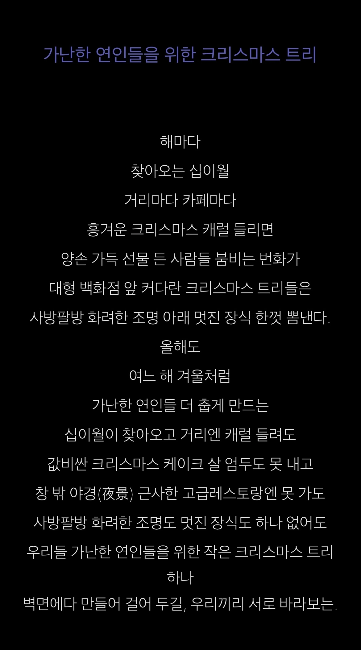 늘 한결같이 필자의 글방을 방문해 주시는 독자분들께 감사의 인사를 드립니다. 종교가 달라도 혹은 종교가 없어도 모두 다 뜻깊은 연말 연휴 보내시길 바랍니다. 성탄절을 맞이하며 탄생을 축복하듯 우리에게는 지금 옆에 있는 서로의 존재 자체가 축복이고 ‘기적’임을 되새기는 소중한 시간들이었으면 합니다. 아주 예전에 쓴 시詩이지만 여기에 첨부합니다. 메리 크리스마스!