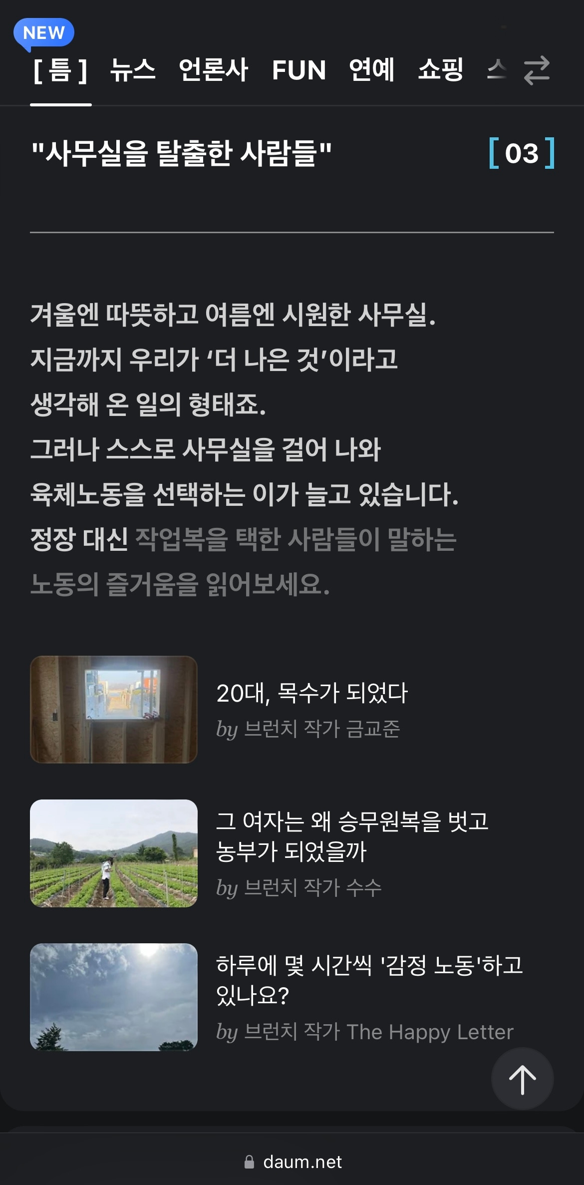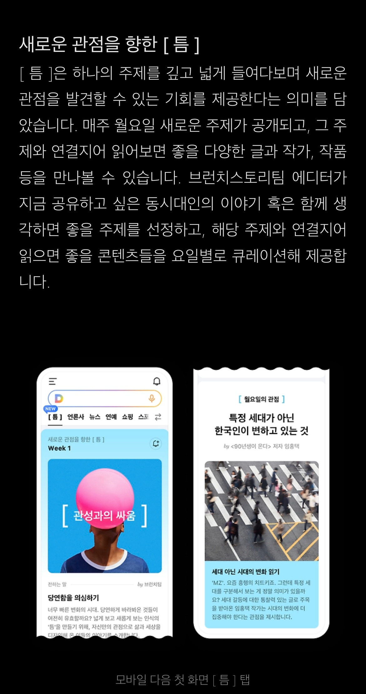 좀 들여다보니 오늘부터 새롭게 시작한 "브런치스토리가 만든 콘텐츠 큐레이션 공간 [ 틈 ] 모바일 다음(Daum) 첫 화면에서 [ 틈 ]을 만나보세요!" 때문이었다.