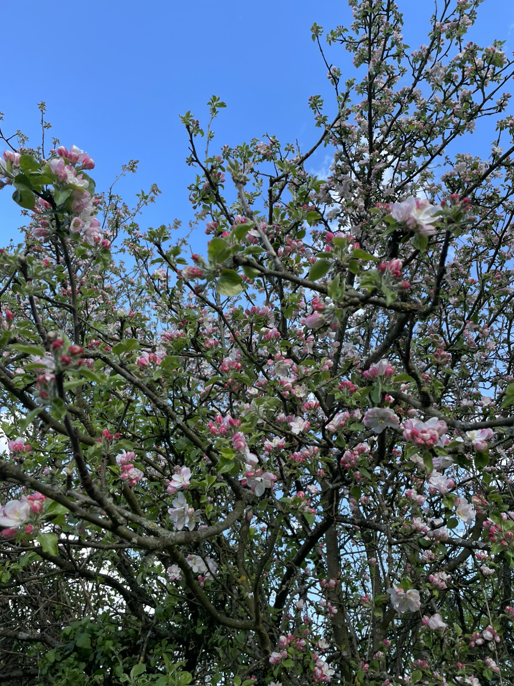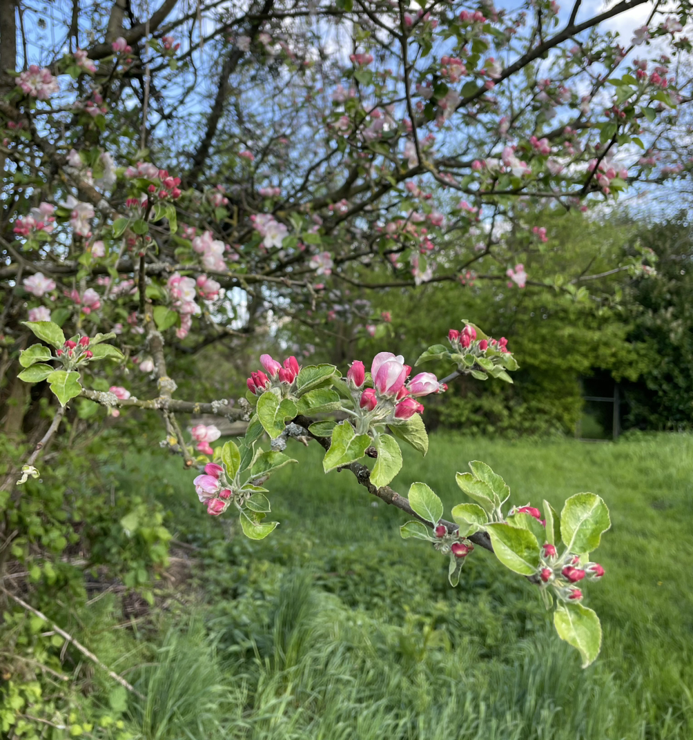 아직 피지 않은 꽃봉오리와 푸릇푸릇 연두색 잎들이 함께 어우러져 아주 싱그럽다. 나중에 이 사과나뭇가지가지마다 빼곡하게 사과 열매들이 맺히면 그때 이 사과나무꽃도 다시 생각나리라.