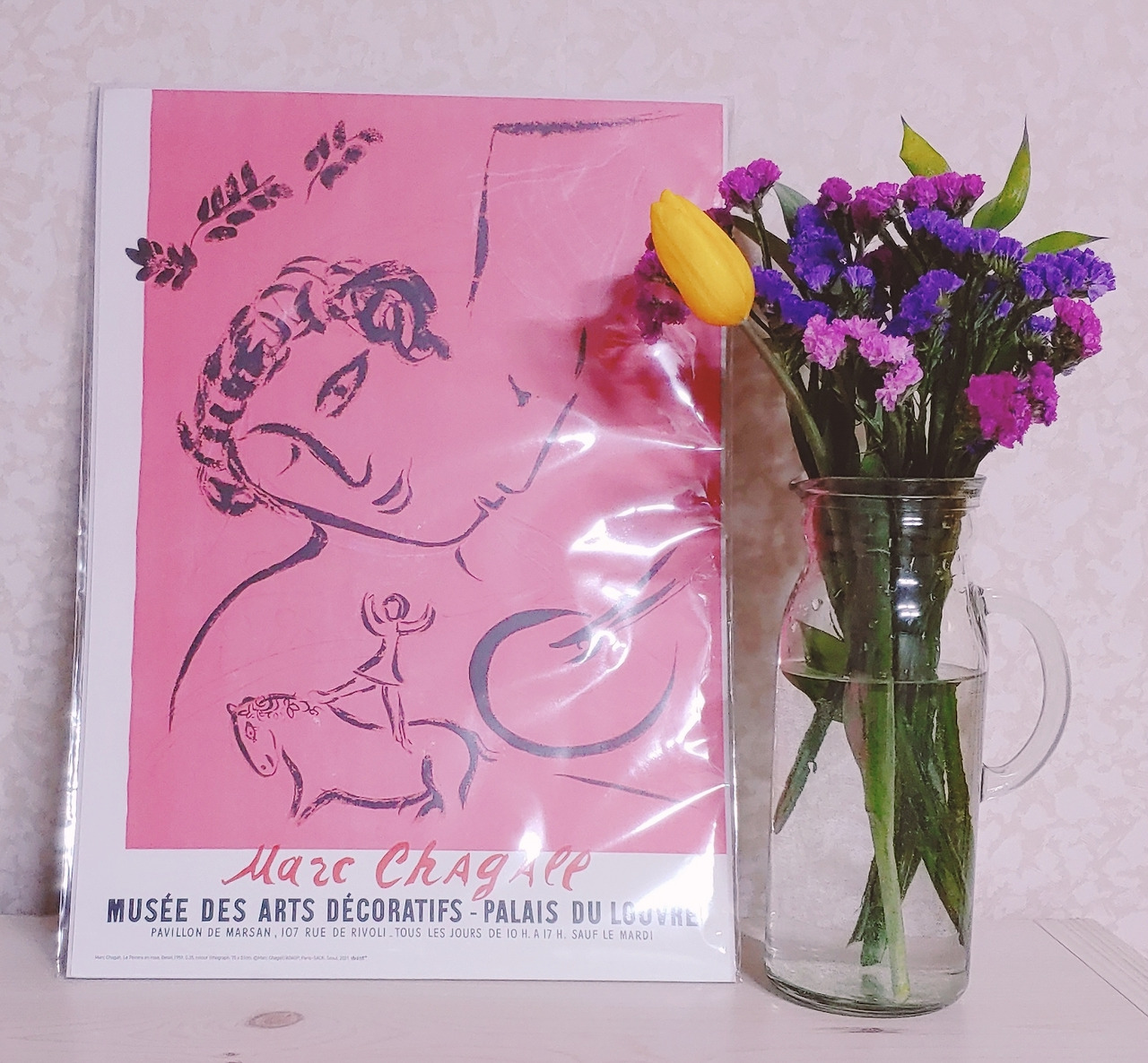 <Le peintre en rose1959, 전시를 다 보고 마음에 들어 엽서 몇 장과 구매한 색상으로 인쇄된 석판화와 마침, 택배로 주문한 꽃들이 도착해서 급 꾸며 보았다.>