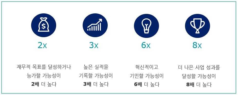 무수한 연구 결과 또한 이를 입증한다. 서로 다른 관점을 가진 사람이 협업하는 '다양성과 포용의 문화를 가진 조직'은 그렇지 않은 조직에 비해 재무적 목표 달성 및 혁신, 더 나은 사업 성과를 달성할 가능성이 2~8배 증가한다.